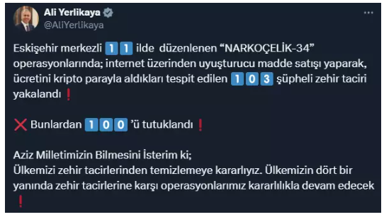 İçişleri Bakanı Ali Yerlikaya'nın verdiği bilgilere göre, Eskişehir merkezli olarak düzenlenen geniş çaplı uyuşturucu operasyonları kapsamında 11 ilde yapılan baskınlarda 100 kişi tutuklandı. "Narkoçelik-34" adı verilen operasyonlar, uyuşturucu madde ticaretine karşı yürütülen mücadelede önemli bir adım olarak kaydedildi.Eskişehir Cumhuriyet Başsavcılığı ve Emniyet Genel Müdürlüğü Narkotik Suçlarla Mücadele Başkanlığı koordinesinde gerçekleştirilen operasyonlar, Eskişehir İl Emniyet Müdürlüğü Narkotik Suçlarla Mücadele Şube Müdürlüğü tarafından yürütüldü. Operasyon, Eskişehir merkezli olup Adana, Ankara, Antalya, Aydın, Manisa, Çanakkale, Hatay, Şanlıurfa, Osmaniye ve Diyarbakır illerini kapsadı.Operasyonlara 150 ekip, 500 personel, 11 narkotik dedektör köpeği ve hava destekli unsurlar katıldı. Toplamda 74 farklı adrese yapılan baskınlarla, uyuşturucu madde ticareti yapan şüpheliler hedef alındı.Yapılan çalışmalarda, internet üzerinden uyuşturucu madde satışı gerçekleştiren şüphelilerin, ödemelerini kripto paralar üzerinden aldığı belirlendi. Operasyonlarda 103 şüpheli yakalanırken, bunlardan 100'ü tutuklanarak cezaevine gönderildi.Emniyet Genel Müdürlüğü'nün açıklamasına göre, tek bir operasyonda 100 tutuklama gerçekleştirildi ve %97 oranında bir başarı elde edildi. Bu operasyon, uyuşturucu ticaretine karşı yürütülen mücadelede önemli bir başarı olarak kayıtlara geçti.Bu operasyonun, uyuşturucu madde ticareti ile mücadelede etkin sonuçlar alınması açısından büyük öneme sahip olduğu belirtiliyor.