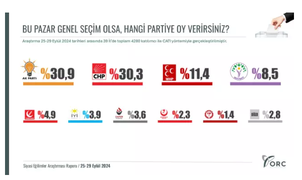 Son seçim anketinin sonuçları, Türk siyasi sahnesinde önemli bir dönüm noktasına işaret ediyor.ORC Araştırma'nın Eylül ayında 39 ilde 4 bin 280 kişiyle gerçekleştirdiği son seçim anketinin sonuçları, kamuoyuyla paylaşıldı.Bu anket, yaklaşan seçimler öncesinde siyasi partilerin oy oranlarını ortaya koyarak, muhalefet ve iktidar arasındaki rekabetin ne denli yüksek olduğunu gözler önüne serdi.Araştırmaya katılanların tercihleri, siyasi partiler arasında ciddi bir çekişme olduğunu gösteriyor. AK Parti’nin oy oranı yüzde 30,9 olarak belirlenirken, CHP’yi tercih edeceğini söyleyenlerin oranı ise yüzde 30,3 oldu. Bu sonuç, iki parti arasındaki farkın yalnızca 0,6 puana düştüğünü ortaya koyuyor.Anketin detaylarına bakıldığında, diğer partilerin oy oranları ise şu şekilde sıralanıyor:MHP: %11,4