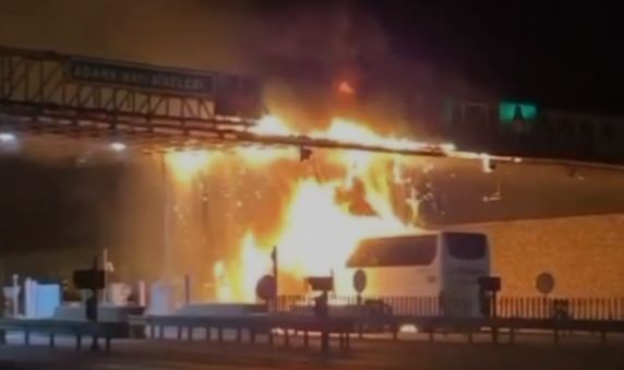 Tarsus-Adana-Gaziantep Otoyolu'nun Adana bölümündeki batı gişelerinde beton bariyere çarptıktan sonra alev alan yolcu otobüsünde 6 kişi yaralandı. Otobüs kullanılamaz hale gelirken gişe de zarar gördü.