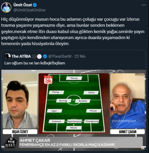 Eski hakem ve ünlü spor yorumcusu Ahmet Çakar, Sivasspor-Fenerbahçe maçının ardından katıldığı bir programda eski futbolcu Ümit Özat'ı hedef alarak "Bu akşam ölecek" dedi.Ümit Özat ise Çakar'ın bu sözlerine, "Merak etme duanla yaşamadım ki temennin ya da hissiyatınla öleyim. Seninle yayın yaptığım için kendimden utanıyorum" şeklinde yanıt verdi.Eski hakem ve ünlü spor yorumcusu Ahmet Çakar, katıldığı bir programda Fenerbahçe'nin eski futbolcusu Ümit Özat'ı hedef alarak, "Bu akşam ölecek" demişti.Çakar, Sivasspor-Fenerbahçe maçının ardından katıldığı programda eski milli futbolcu Ümit Özat'ı hedef aldı. "Şu anda bir şey hissettim; Ümit Özat bu akşam ölecek" diyen Çakar'a sunucu "Allah korusun hocam, niye ölsün ya" diye tepki verdi.Ancak Çakar, bu sözleri sarf etmeye devam etti; "Vallahi diyorum, hissettim, hissettim… Hissettim, ölecek" dedi.Çakar'ın bu sözlerine kayıtsız kalmayan Ümit Özat, ailesinden birilerinin bu görüntüleri izlerse travma yaşayabileceğini belirterek, "Hiç düşünmüyor musun hoca, 'Bu adamın çoluğu var çocuğu var, izlerse travma yaşar mı, yaşamaz mı' diye. Ama bunlar senden beklenen şeyler. Merak etme itin duası kabul olsa gökten kemik yağar. Seninle yayın yaptığım için kendimden utanıyorum.Ayrıca duanla yaşamadım ki temennin ya da hissiyatınla öleyim" şeklinde bir yanıt verdi.