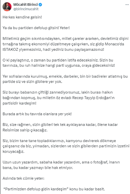 AK Parti İzmir Milletvekili Şebnem Bursalı, Monako Yat Kulübü'nde yediği ıstakozun fotoğrafını sosyal medya hesabından paylaştı. Bursalı'nın mesajına sert tepki gösteren AK Parti MKYK Üyesi Mücahit Birinci, ''Herkes kendine gelsin! Ya da bu partiden defolup gitsin, yeter'' ifadelerini kullandı.AK Parti İzmir Milletvekili Şebnem Bursalı'nın Monaco'da yediği ıstakozun fotoğrafını sosyal medya hesabından paylaşması partiyi karıştırdı.AK Parti'de tartışma yaratan 'ıstakoz' paylaşımı: Herkes kendine gelsin ya da bu partiden defolup gitsinAK Parti MKYK Üyesi Mücahit Birinci, Bursalı'nın paylaşımına sert tepki gösterdi. Sosyal medya hesabından açıklama yapan Birinci, şu paylaşımda bulundu; "Milletimiz geçim sıkıntısındayken, millet çareler ararken, devletimiz dişini tırnağına takmış ekonomiyi düzeltmeye çalışırken, siz gidip Monaco'da ISTAKOZ yiyemezsiniz, hadi yediniz bunu paylaşamazsınız!O ki paylaştınız, o zaman bu partiden istifa edeceksiniz. Sizin bu tavrınıza, bu ruh halinize hangi parti uygunsa, oraya gideceksiniz! Yer sofralarında kurulmuş, emekle, darbeler, bin bir badireler atlatmış bu partide siz ve sizin gibilere yer yok. Siz burayı babanızın çiftliği zannediyorsunuz, lakin burası halkın bağrından kopmuş, bu milletin öz evladı Recep Tayyip Erdoğan'ın partisidir kardeşim!Burada artık bu tavırda olanlara yer yok! Biz, size rağmen, sizin gibileri tek tek ayıklayana kadar, ölene kadar Reisimize sahip çıkacağız.Siz, bizim tane tane topladıklarımızı, kamyonu devirerek dökmeye çalışsanız da biz, yılmadan, sizlerden ve sizin gibilerden partimizin izzetini koruyacağız. Uzun uzun yazardım, sabaha kadar yazardım, ama o fotoğraf, inanın bana, bu kadar yazmayı bile hak etmiyor. Aslında tek cümle yeter; "Partimizden defolup gidin kardeşim" konu bu kadar basit."AK Parti'de tartışma yaratan 'ıstakoz' paylaşımı: Herkes kendine gelsin ya da bu partiden defolup gitsinÖte yandan AK Parti Hatay Milletvekili Abdulkadir Özel de Bursalı'nın "ıstakoz" paylaşımına tepki göstererek "Hem halktan sokaktan kopuk hem de yediğini gezdiğini paylaşacak kadar görgüsüz…" dedi.AK Parti İzmir Milletvekili Şebnem Bursalı'dan "ıstakoz" paylaşımına ilginç savunmaMonaco'da yediği ıstakozun fotoğrafını sosyal medyada paylaşınca tepkilerin odağı haline gelen AK Parti İzmir Milletvekili Şebnem Bursalı'dan ilginç bir savunma geldi.Kendisini eleştirenlerin Antalya'daki teleferik kazasını unutturmak için gündem değiştirmeye çalıştığını söyleyen Bursalı, "İhmal sonucu günahsız insanlarımızın hayatını kaybettiği, yaralandığı ve saatlerce mahsur kaldığı elim olayla ilgili tek bir söz etmeyenlerin, ne amaçla bu olayı çarpıttığını da biliyoruz" ifadelerini kullandı.