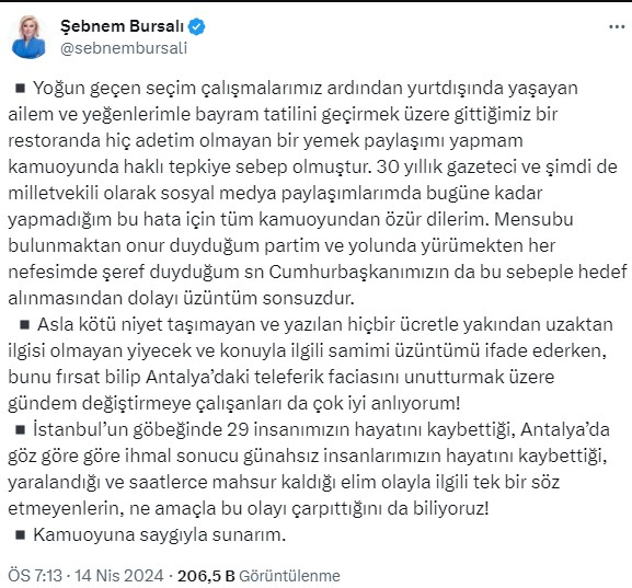 Monaco'da yediği ıstakozun fotoğrafını paylaşınca tepki çeken AK Partili İzmir Milletvekili Şebnem Bursalı sessizliğini bozdu. AK Partili isimlerinden de tepki gösterdiği olaya ilginç bir savunma yapan Bursalı, "İhmal sonucu günahsız insanlarımızın hayatını kaybettiği, yaralandığı ve saatlerce mahsur kaldığı elim olayla ilgili tek bir söz etmeyenlerin, ne amaçla bu olayı çarpıttığını da biliyoruz" ifadelerini kullandı.AK Parti İzmir Milletvekili Şebnem Bursalı'nın Monaco'da yediği ıstakozun fotoğrafını sosyal medyada paylaşması tepkileri de beraberinde getirdi. AK Partili bazı isimlerin de tepki gösterdiği Bursalı sessizliğini bozdu.AK Parti İzmir Milletvekili Şebnem BursalıAK Parti İzmir Milletvekili Şebnem BursalıSosyal medya hesabından açıklamada bulunan Bursalı ilginç bir savunma yaptı. Bursalı, Beşiktaş'ta 29 kişinin hayatını kaybettiği yangın ve Antalya'daki teleferik kazasını unutturmak isteyenlerin gündem değiştirme amacıyla kendisine yüklendiğini savundu.AK Partili Bursalı şunları söyledi: "Yoğun geçen seçim çalışmalarımız ardından yurtdışında yaşayan ailem ve yeğenlerimle bayram tatilini geçirmek üzere gittiğimiz bir restoranda hiç adetim olmayan bir yemek paylaşımı yapmam kamuoyunda haklı tepkiye sebep olmuştur.30 yıllık gazeteci ve şimdi de milletvekili olarak sosyal medya paylaşımlarımda bugüne kadar yapmadığım bu hata için tüm kamuoyundan özür dilerim. Mensubu bulunmaktan onur duyduğum partim ve yolunda yürümekten her nefesimde şeref duyduğum sn Cumhurbaşkanımızın da bu sebeple hedef alınmasından dolayı üzüntüm sonsuzdur.Asla kötü niyet taşımayan ve yazılan hiçbir ücretle yakından uzaktan ilgisi olmayan yiyecek ve konuyla ilgili samimi üzüntümü ifade ederken, bunu fırsat bilip Antalya'daki teleferik faciasını unutturmak üzere gündem değiştirmeye çalışanları da çok iyi anlıyorum!"İstanbul'un göbeğinde 29 insanımızın hayatını kaybettiği, Antalya'da göz göre göre ihmal sonucu günahsız insanlarımızın hayatını kaybettiği, yaralandığı ve saatlerce mahsur kaldığı elim olayla ilgili tek bir söz etmeyenlerin, ne amaçla bu olayı çarpıttığını da biliyoruz! Kamuoyuna saygıyla sunarım"AK Partili Bursalı'dan 'ıstakoz' paylaşımına ilginç savunmaAk Parti MKYK Üyesi Mücahit Birinci, Bursalı'nın paylaşımına sert tepki göstermişti. Sosyal medya hesabından açıklama yapan Birinci, şu paylaşımda bulundu; "Milletimiz geçim sıkıntısındayken, millet çareler ararken, devletimiz dişini tırnağına takmış ekonomiyi düzeltmeye çalışırken, siz gidip Monaco'da ISTAKOZ yiyemezsiniz, hadi yediniz bunu paylaşamazsınız!O ki paylaştınız, o zaman bu partiden istifa edeceksiniz. Sizin bu tavrınıza, bu ruh halinize hangi parti uygunsa, oraya gideceksiniz! Yer sofralarında kurulmuş, emekle, darbeler, bin bir badireler atlatmış bu partide siz ve sizin gibilere yer yok.Siz burayı babanızın çiftliği zannediyorsunuz, lakin burası halkın bağrından kopmuş, bu milletin öz evladı Recep Tayyip Erdoğan'ın partisidir kardeşim!Burada artık bu tavırda olanlara yer yok! Biz, size rağmen, sizin gibileri tek tek ayıklayana kadar, ölene kadar Reisimize sahip çıkacağız.Siz, bizim tane tane topladıklarımızı, kamyonu devirerek dökmeye çalışsanız da biz, yılmadan, sizlerden ve sizin gibilerden partimizin izzetini koruyacağız. Uzun uzun yazardım, sabaha kadar yazardım, ama o fotoğraf, inanın bana, bu kadar yazmayı bile hak etmiyor. Aslında tek cümle yeter; "Partimizden defolup gidin kardeşim" konu bu kadar basit."