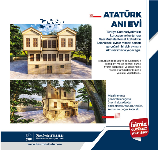 Gazi Mustafa Kemal Atatürk’ün Selanik’te doğup büyüdüğü evin mimari açıdan birebir aynısını Akhisar’da yapacaklarını müjdeleyen Akhisar Belediye Başkanı ve Adayı Besim Dutlulu, evin içerisinde oluşturulacak müzede vatandaşların gezerek tarihin derinliklerine yolculuk yapabileceklerini vurguladı.