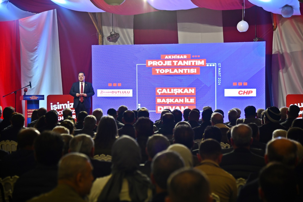 Akhisar Belediye Başkanı ve Cumhuriyet Halk Partisi (CHP) Belediye Başkan Adayı Besim Dutlulu, 31 Mart’ta gerçekleşecek mahalli idareler seçimleri öncesinde yeni dönemde hayata geçirmek istediği projelerini anlattı.Akhisar Tütün Otel Salonu’nda düzenlenen Cumhuriyet Halk Partisi Akhisar Belediye Başkan Adayı Besim Dutlulu’nun kente değer katacak projelerinin anlatıldığı toplantıya, Manisa Milletvekili A. Vehbi Bakırlıoğlu, Manisa Büyükşehir Belediye Başkan Adayı Ferdi Zeyrek, Cumhuriyet Halk Partisi Manisa İl Başkanı İlksen Uludağ ve il yöneticileri, CHP Akhisar İlçe Başkanı Hayriye Hacet ve ilçe yöneticileri, geçmiş dönem belediye başkanları, milletvekilleri, sivil toplum kuruluşları, muhtarlar ve çok sayıda vatandaş katıldı.Salon tamamen dolarken binlerce vatandaş da proje tanıtım toplantısını canlı yayından takip etti. Proje tanıtım toplantısı adeta dev bir mitinge dönüşürken yaklaşık 400 kişinin Cumhuriyet Halk Partisi ailesine katılımı ile rozet takma töreni düzenlendi. Başkan Dutlulu, sunumun ilk kısmında pandemi ve yaşanan deprem süreçlerinde yaptığı çalışmalar ile tüm zorluklara rağmen Akhisar’a kazandırdıkları hizmetlerden bahsetti. Uğur Mumcu Kültür ve Sanat Merkezi, Şehit Reşat Ergin Ulucami Cumartesi Pazarı, Hanpaşa Güneş Enerji Santrali, Boyalılar Güneş Enerji Santrali, Seyitahmet Mahallesi Sağlık Ocağı, Mahalle Kreşleri (Seyitahmet-Efendi-Hürriyet), Süt Kuzusu Projesi, Etüt Merkezi, akhisar belediyesi Aşevi, Ambulans ve Hasta Nakil Hizmeti, Spor Merkezi, Evde Bakım ve Temizlik Hizmeti, Kapalı İşçi Durakları, Kadın ve Aile Danışma Merkezi, Sağlıklı Yaşam ve Danışma Merkezi, Sahipsiz Sokak Hayvanları Doğal Yaşam Alanı, Ücretsiz Bisiklet Hizmeti, Bisiklet ve Trafik Eğitim Parkı, Beton Santrali, Karavan Park, Kayalıoğlu Sosyal Tesisi, Bakkal Kart Hizmeti, Yakacak Yardımları, Esnaf Destek Paketleri, Bebek Bakım ve Emzirme Kabinleri, 144 yeni park, beldelere meydan düzenlemeleri, yeni spor ve oyun sahaları, masa tenisi salonu, Çağlak Güreşleri, unutulmaz konserler, Kadın ve Tarım Kooperatifleri, Tarımsal Kalkınma Hamleleri, Engelsiz Kafe, Çağlak Parkı ve Kafesi, Zeytin Kafe, Kadın Emeği ve Sanat Sokağı, Ücretsiz İnternet Hizmeti gibi birbirinden önemli projeler katılımcılara Başkan Dutlulu tarafından anlatıldı. Yeni dönem projelerini 2 başlıkta ele alan Başkan Besim Dutlulu, tarımda, sanayide, teknolojide, turizmde, eğitimde, sanatta, kültürde her bakımdan Akhisar’a değer katacak birbirinden önemli projeleri ile ilçeyi Türkiye’de tanınır bir cazibe merkezi yapmayı hedeflediklerini söyledi. ‘Biz halkımıza bazıları gibi hayal satmayacağız. Nasıl ki 5 yılda Akhisar’ımıza birbirinde değerli hizmetler kazandırdıysak yeni dönemde de aynı azim ve kararlılıkla, halkımız için çalışmaya devam edeceğiz’ diyen Başkan Besim Dutlulu’nun yeni dönem projeleri şu şekilde; SOĞUK TULUMBA ÇARŞI KATLI OTOPARK PROJESİMİSAK-I MİLLİ MEYDANI