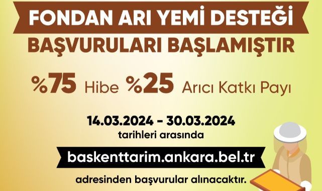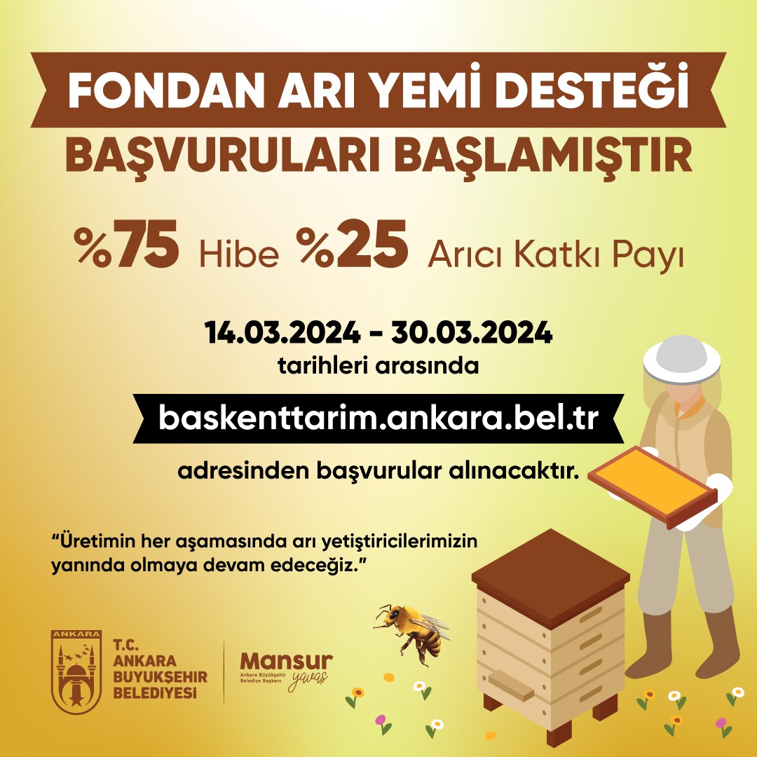 Ankara Büyükşehir Belediyesi, arıcılara Fondan Arı Yemi Desteği için başvuru sürecini başlattı. %75 hibe %25 arıcı katkı paylı destekten faydalanmak isteyen arıcılar, 12 Mart 2024 – 30 Mart 2024 tarihleri arasında baskenttarim.ankara.bel.tr adresinden başvuru yapabilecek. Ankara Büyükşehir Belediyesi, Başkentte tarım ve hayvancılık faaliyetlerinin geliştirilmesi amacıyla verdiği kırsal destekleri çeşitlendirmeye devam ediyor. Kırsal Hizmetler Daire Başkanlığı, Başkentli arıcıların, küresel iklim değişikliğinin olumsuz etkilerini ekonomik düzeyde azaltmak için Fondan Arı Yemi Desteği için başvuru sürecini başlattı.ARI YEMİ DESTEĞİ İÇİN BAŞVURU SÜRECİ BAŞLADI“Arı Varsa Tarım, Üretim Varsa Gelecek Vardır” sloganıyla daha önce arıcılara akademik düzeyde eğitimler veren, arıcılık dergisi ile bilgilendirmeler yapan ABB, şimdide arıcılara Fondan Arı Yemi Desteği verecek. Bahar aylarında arıların beslenmesi ve arıcılığın geliştirilmesi amacıyla %75 hibe %25 arıcı katkı paylı verilecek arı yemi desteğine çiftçiler, 12.03.2024- 30.03.2024 tarihleri arasında baskenttarim.ankara.bel.tr adresi üzerinden başvuru yapabilecek.