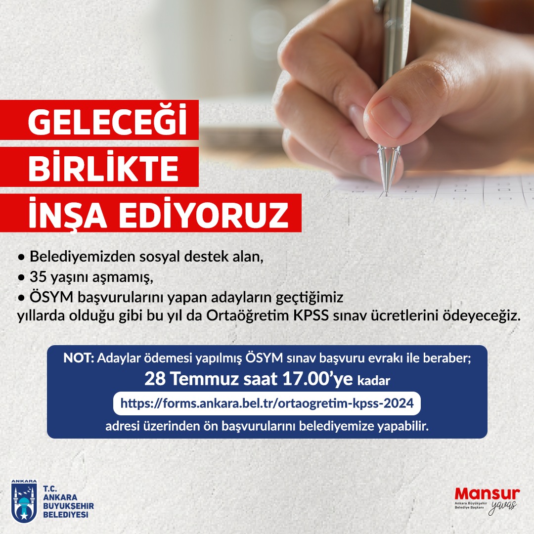 Ankara Büyükşehir Belediyesi, sosyal destek alan ailelerin 35 yaşını aşmamış adayların “2024 KPSS Ortaöğretim Sınavı”na ait başvuru ücretlerini karşılayacak. ÖSYM başvurularını yapan adaylar, ‘2024 KPSS Ortaöğretim Başvuru Belgesi’ni en geç 28 Temmuz 2024 tarihine kadar sisteme yükleyerek başvuruda bulunabilecek. Ankara Büyükşehir Belediyesi, “Geleceği Birlikte İnşa Ediyoruz” sloganıyla eğitimde fırsat eşitliği sağlayan öğrenci dostu uygulamalarına devam ediyor. Sosyal Hizmetler Dairesi Başkanlığı, Ankara Büyükşehir Belediyesinden sosyal destek alan ve 35 yaşını aşmamış adayların 2024 KPSS Ortaöğretim Başvuru ücretlerini geçmiş yıllar da olduğu gibi bu yıl da karşılayacak.ÖN BAŞVURU İÇİN SON GÜN 28 TEMMUZ