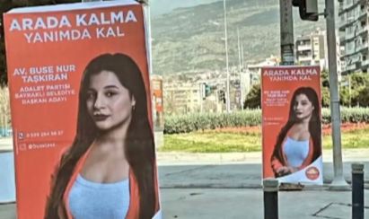 Adalet Partisi Bayraklı Belediye Başkan adayı Av. Buse Nur Taşkıran, "Arada kalma, yanımda kal" sloganıyla kararsız seçmene seslendi. Sosyal medyada büyük yankı uyandıran seçim sloganıyla ilgili "Albüm kapağı zannettim" şeklinde yorumlar yapıldı.