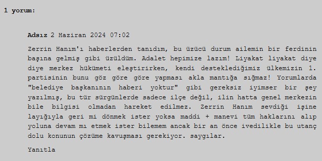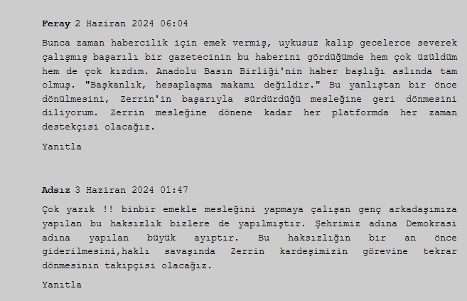 Somuncu: Gazetecilik Sürgün Edilemez!2019 yılından bu yana Samsun Atakum Belediyesi'nde "Gazeteci" ünvanıyla görev yapan ve T.C. Cumhurbaşkanlığı tarafından verilen basın kartına sahip Gazeteci Zerrin Somuncu, 31 Mart 2024 yerel seçimleri sonrası "Başkan talimatıyla" temizlik görevlisi olarak adeta sürgün edildi. Bu hukuksuz karar karşısında iş akdini feshederek beş yıllık görevini bırakmak zorunda kalan Somuncu, hak mücadelesini yargıya taşıdı.Gazeteci Zerrin Somuncu'nun Sürgün Edilmesi ve Hukuk MücadelesiMemleketi Samsun’da 10 yılı aşkın süredir gazetecilik görevini sürdüren ve 2019 yılından bu yana Samsun Atakum Belediyesi’nde "Gazeteci" ünvanıyla çalışan Zerrin Somuncu, 31 Mart 2024 yerel seçimleri sonrası "Başkan talimatıyla" sürgün şoku yaşadı. T.C. Cumhurbaşkanlığı tarafından verilen basın kartı sahibi olan ve binlerce habere imza atan Somuncu, "Gazetecilik sürgün edilemez" diyerek hak mücadelesini yargıya taşıdı.Anadolu Basın Birliği’nden KınamaGazeteci Zerrin Somuncu’nun yaşadığı hak gaspı, ulusal gazete ve televizyonlarda da geniş yer buldu. Atakum Belediyesi’ni "Başkanlık makamı hesaplaşma yeri değildir" diyerek kınayan Anadolu Basın Birliği’nin yanı sıra pek çok demokratik kitle örgütü ve vatandaşlar hukuksuzluğun karşısında durarak itirazlarını sosyal medyada dile getirdi. Gazeteci Somuncu’nun gelişmeleri okuyucularla paylaştığı www.gazeteciliksurgunedilemez.com isimli internet sitesinde yapılan yorumlarla sorumlulara adeta tepki yağdı.Cemiyetlere Destek ÇağrısıGazeteci Zerrin Somuncu’nun "Temizlik Görevlisi" olarak sürülmesi skandalının ardından avukatı Ayşe Mine Durmaz aracılığıyla arabuluculuk sürecine giren Somuncu, Atakum Belediyesi’nin kıdem ve manevi tazminat taleplerini reddetmesi üzerine hukuksuz görevlendirmeyi mahkemeye taşıdı. Konuyla ilgili yaptığı açıklamada Somuncu, "Hukuksuz biçimde beş yıldır büyük bir emek ve titizlikle sürdürdüğüm görevimi bırakmak zorunda kaldım.Bu hukuksuzluğun yüce adalet önünde yargılanarak cezasız kalmayacağına inanıyorum. Mayıs ayından bu yana sürdürdüğüm hak mücadeleme verdiğiniz destek çok değerli. Şimdi, önümüzdeki yargı sürecinde üyesi olduğum meslek kuruluşları Samsun Gazeteciler Cemiyeti ile Samsun 19 Mayıs Gazeteciler Cemiyeti başta olmak üzere emek, demokrasi ve meslek örgütlerine; elbette yıllar boyunca hizmet etmekten büyük gurur duyduğum Atakumlulara haklı davamın arkasında durma çağrısı yapıyorum.Adaletin er ya da geç tecelli edeceğine olan inancımla, bu zorlu ama sonu aydınlık yolda yanımda olan herkese tekrar teşekkür ediyorum" dedi.