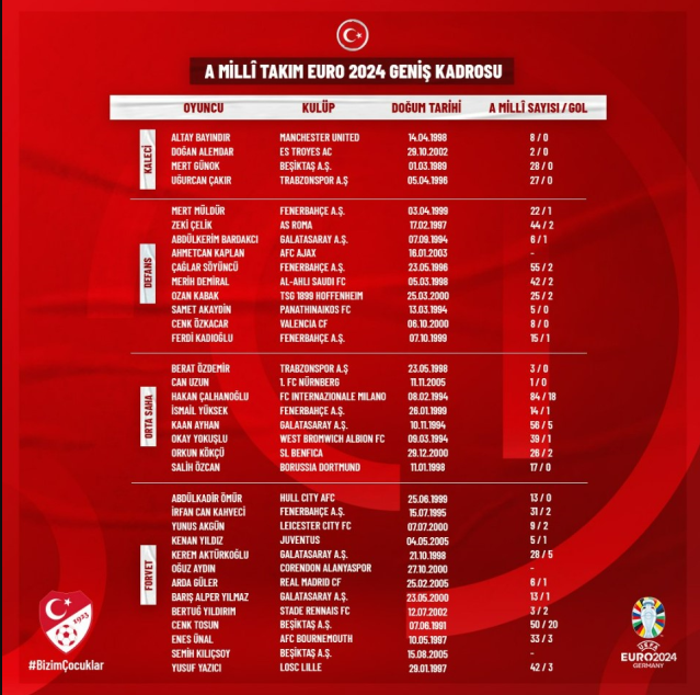 2024 Avrupa Şampiyonası için Türkiye'nin heyecanı dorukta! Almanya'nın ev sahipliğinde düzenlenecek bu büyük turnuva için A Milli Takımımızın geniş kadrosu açıklandı. Genç yıldızlarla dolu kadro, umut verici bir geleceğe işaret ediyor.Milli Takım, turnuva öncesinde son Avrupa Şampiyonu İtalya ve Polonya ile özel maçlar oynayacak. İstanbul'da toplanan ekip, Riva'da sıkı bir şekilde çalışacak ve ardından İtalya'ya geçecek. Bologna kentindeki özel maçın ardından Polonya'da kampa girecekler.Ayrıca, a milli takım ve Ümit Milli Takım, güçlerini birleştirerek ortak kamplar yapacaklar. İki takım, İtalya ve Polonya'da antrenman maçları oynayarak birbirlerini geliştirecekler.Hazırlıkların son aşamasında A Milli Takım, Almanya'nın Barsinghausen kasabasındaki tesislerde son dokunuşlarını yapacak. Ardından Avrupa Şampiyonası'nda mücadele edecekler.Heyecanla beklenen Euro 2024 yolculuğu başlıyor! Türkiye'ye başarılar dileriz.