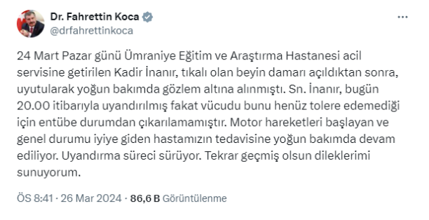 Sayın İnanır, bugün 20.00 itibarıyla uyandırılmış fakat vücudu bunu henüz tolere edemediği için entübe durumdan çıkarılamamıştır. Motor hareketleri başlayan ve genel durumu iyiye giden hastamızın tedavisine yoğun bakımda devam ediliyor.Uyandırma süreci sürüyor. Tekrar geçmiş olsun dileklerimi sunuyorum."