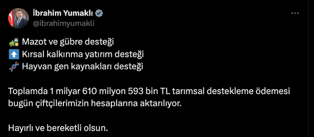 Tarım ve Orman Bakanı İbrahim Yumaklı, çiftçilerin beklediği ödemeyle ilgili önemli bir duyuru yaptı.