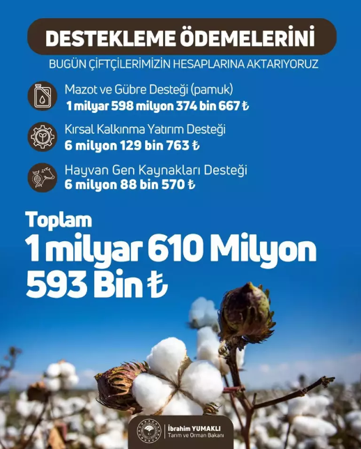 Tarım ve Orman Bakanı İbrahim Yumaklı, çiftçilerin beklediği ödemeyle ilgili önemli bir duyuru yaptı.Tarım ve Orman Bakanı İbrahim Yumaklı, 1 milyar 610 milyon 593 bin liralık tarımsal destekleme ödemesinin bugün çiftçilerin hesaplarına aktarılacağını söyledi.Bakanlık sosyal medya platformu X üzerinden yaptığı açıklamada konuya ilişkin bilgi verdi.Yapılan paylaşıma göre, bugün çiftçilere toplamda 1 milyar 610 milyon 593 bin TL tutarında tarımsal destekleme ödemesi aktarıldı.