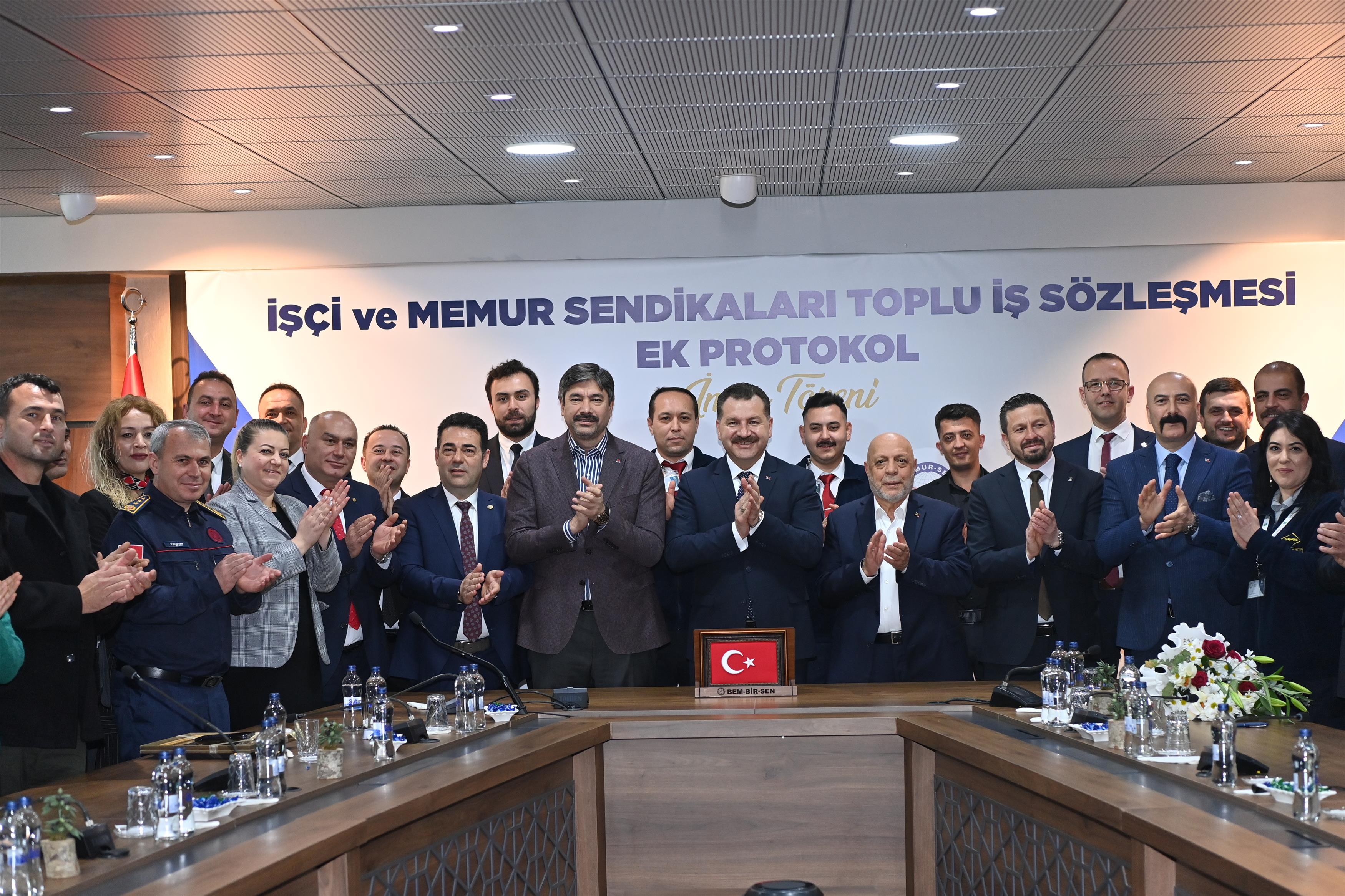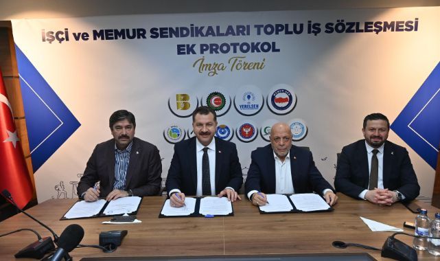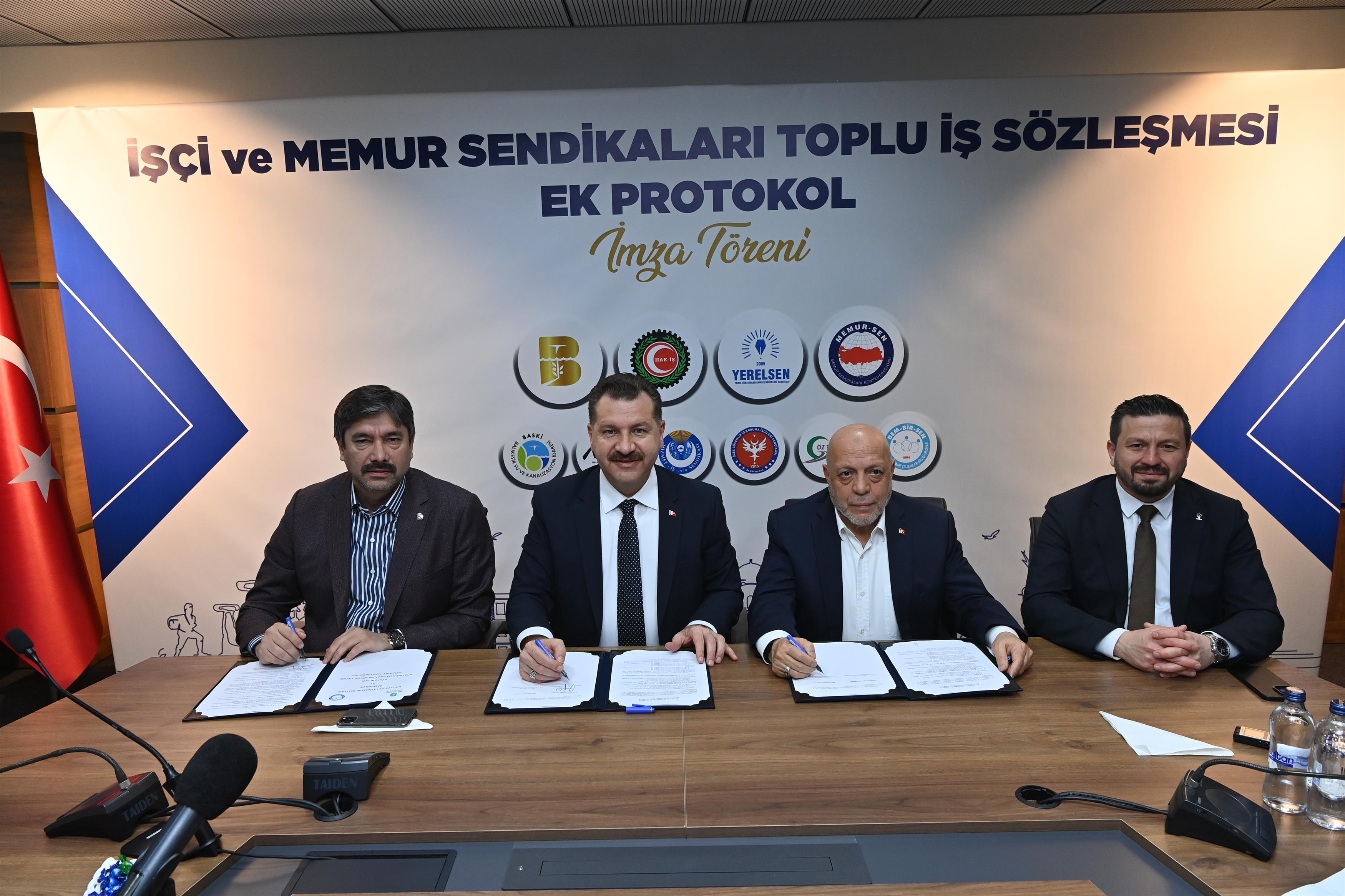 Balıkesir Büyükşehir Belediye Başkanı Yücel Yılmaz; HAK-İŞ Sendikası Genel Başkanı Mahmut Arslan ve Bem-Bir-Sen Başkanı Levent Uslu ile birlikte “İşçi ve Memur Sendikaları Toplu İş Sözleşmesi Ek Protokolü”nü imzaladı.