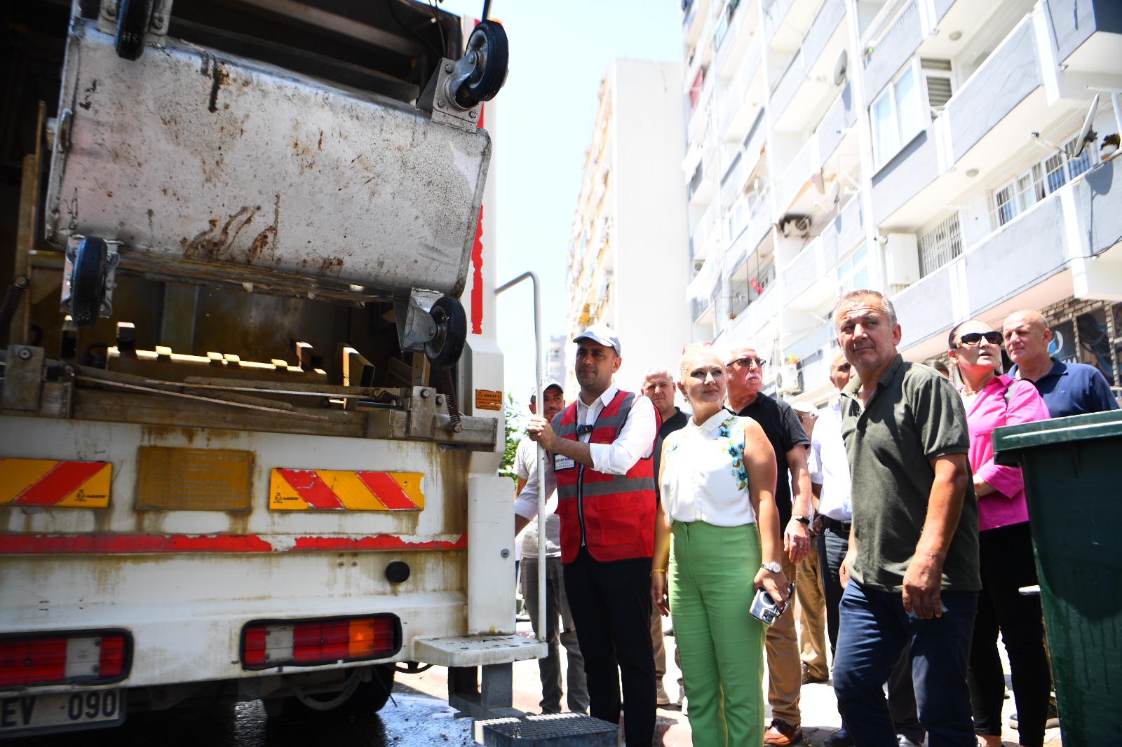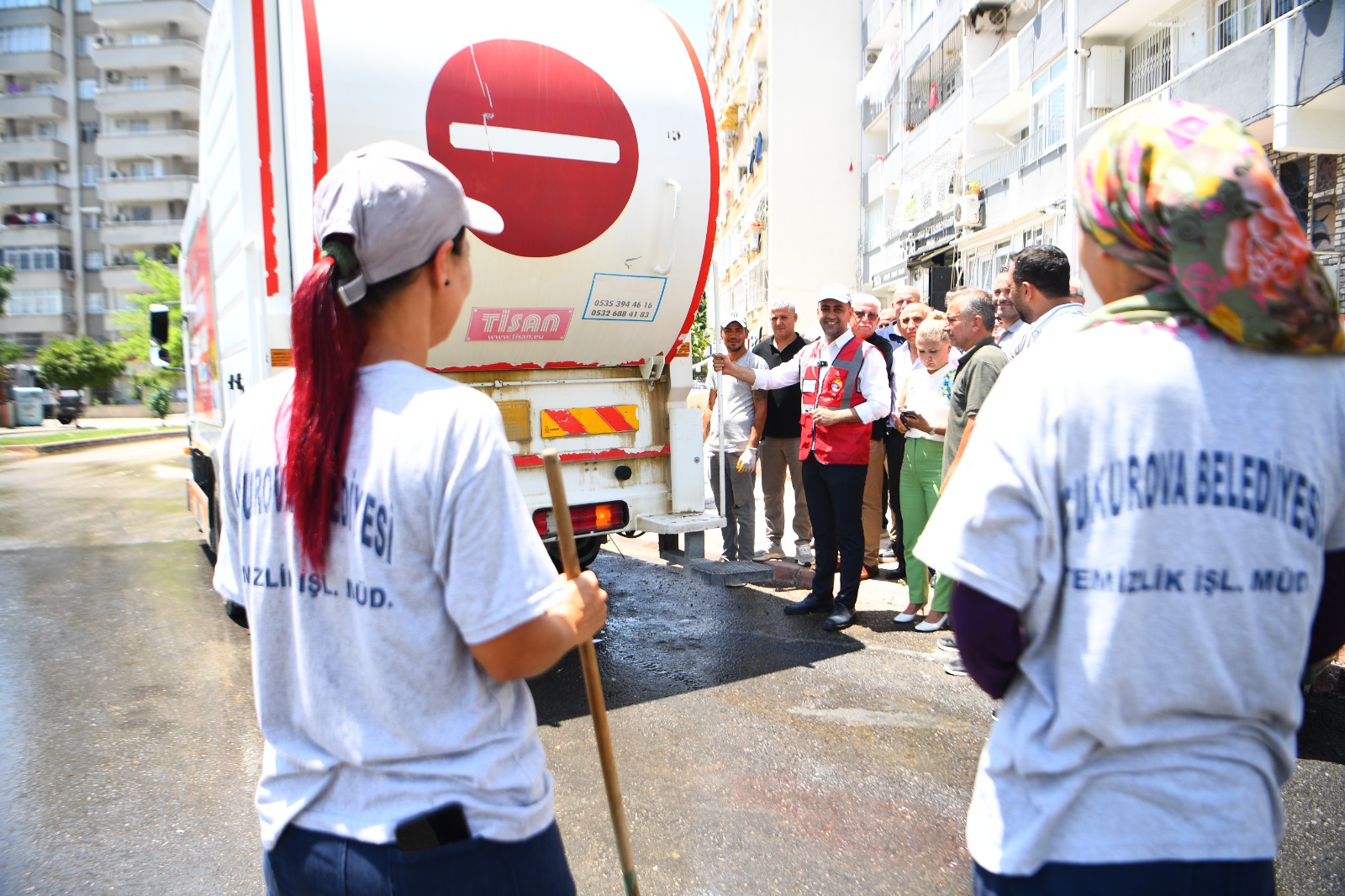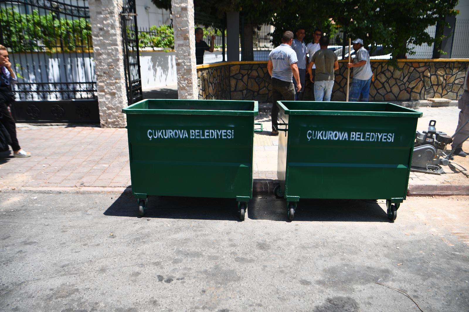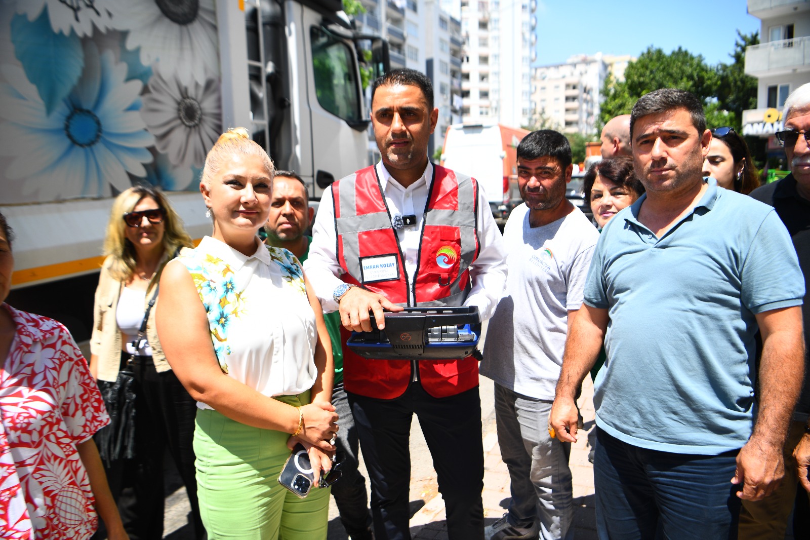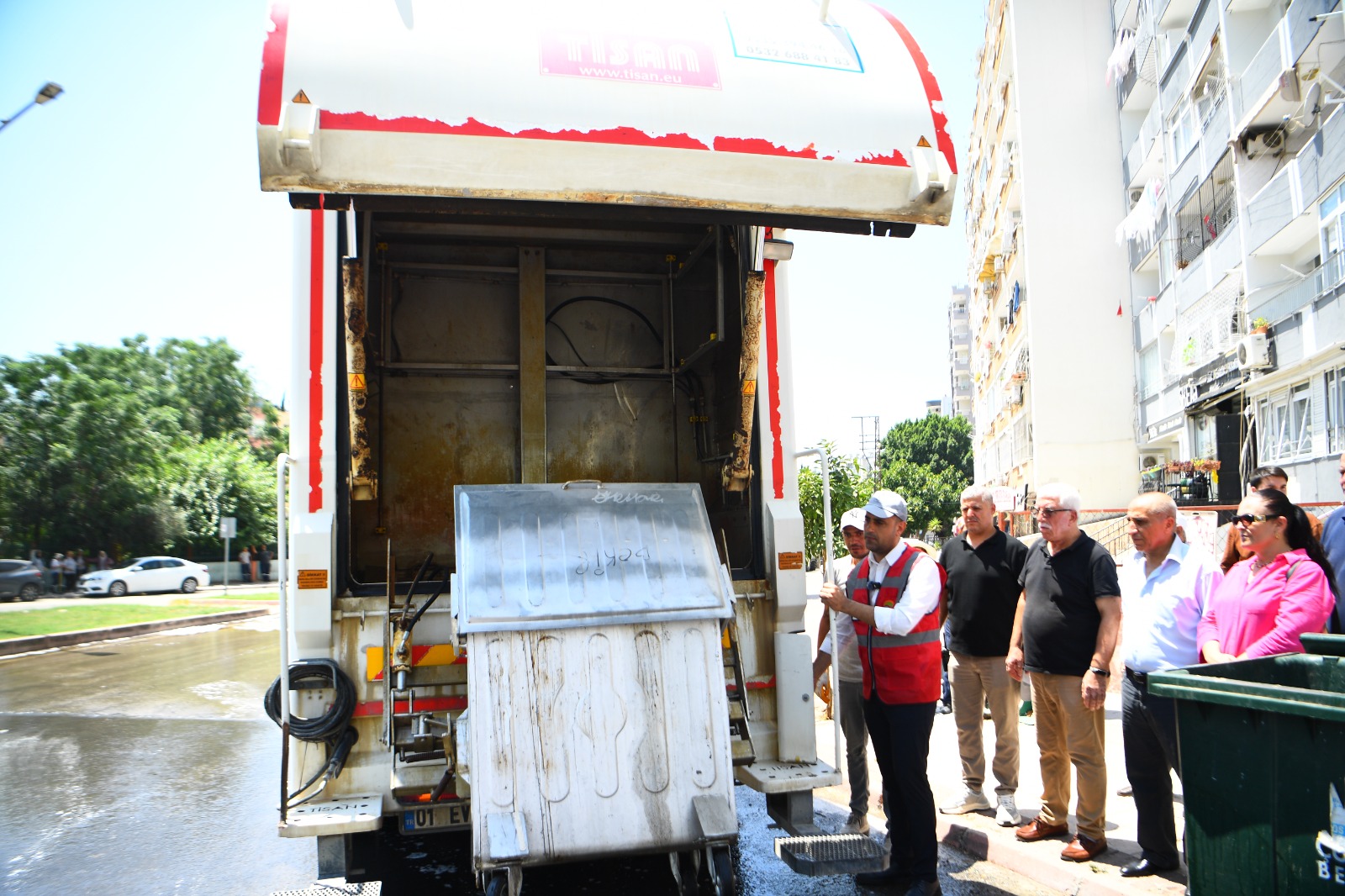 Kapatılan yer altı konteynerinin yerine yer üstü konteynerleri yerleştirilirken, Başkan Kozay konteyner yıkama çalışmalarını da denetledi. Süpürge aracıyla sokakları süpüren Başkan Kozay, arazözle mahalledeki sokakları portakal çiçeği kokulu suyla yıkadı. ÇİÇEK GİBİ BİR ÇUKUROVA İÇİN ÇALIŞIYORUZ