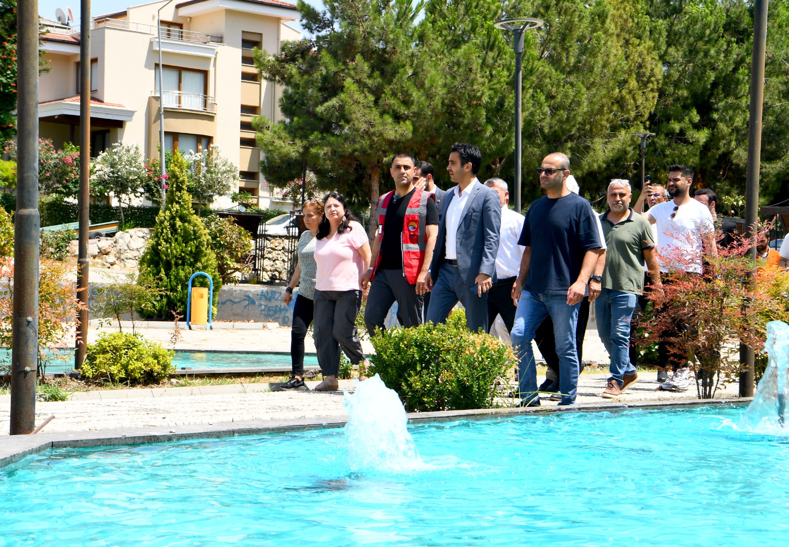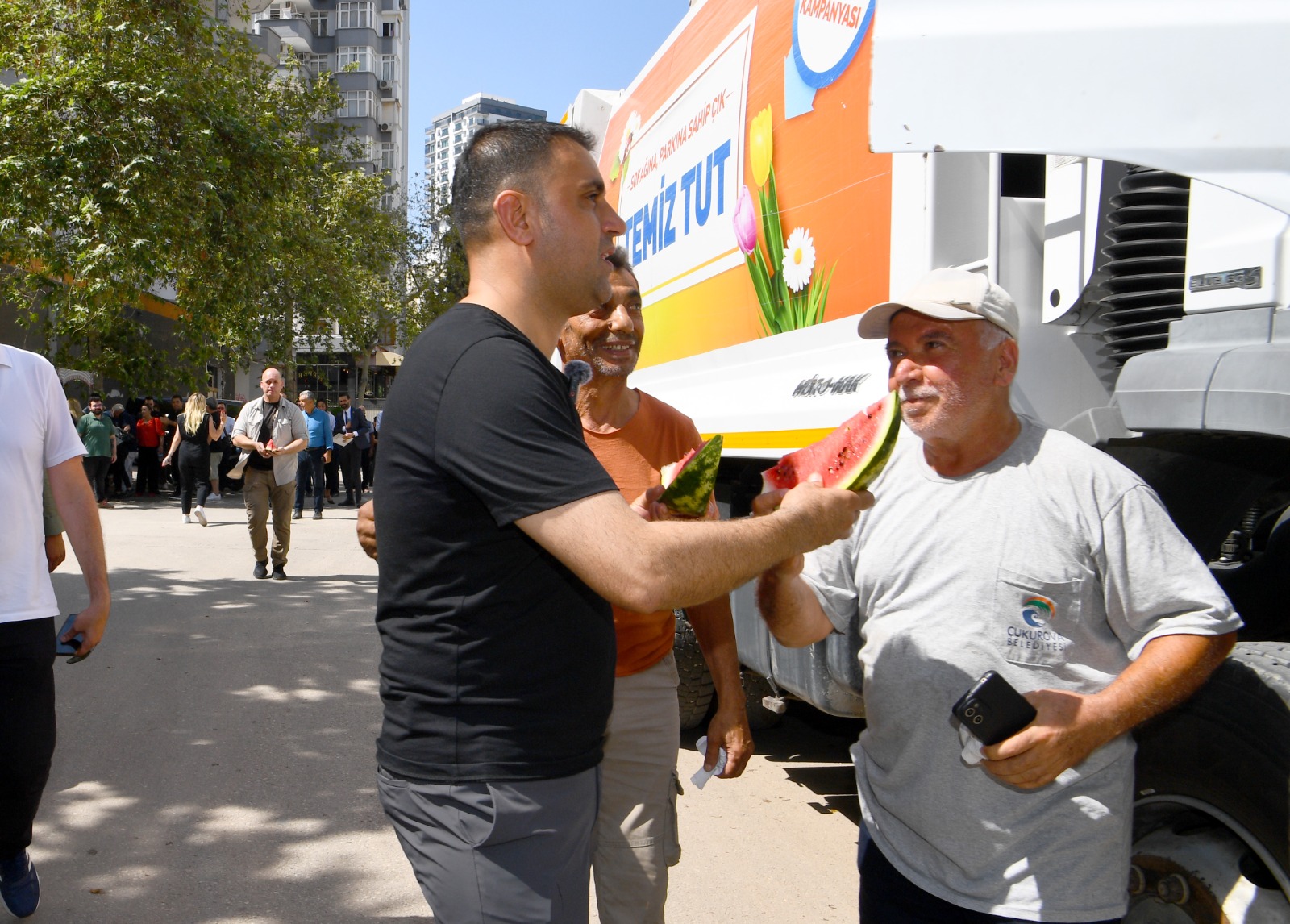Buradan yürüyerek Mahfesığmaz Mahallesi’ndeki Beyhan İmge Parkı’na geçen Başkan Kozay, parktaki çalışmaları inceledi, su oyun parkında serinleyen çocukların mutluluğuna ortak oldu. MESAİ ARKADAŞLARINA KARPUZ İKRAM ETTİ