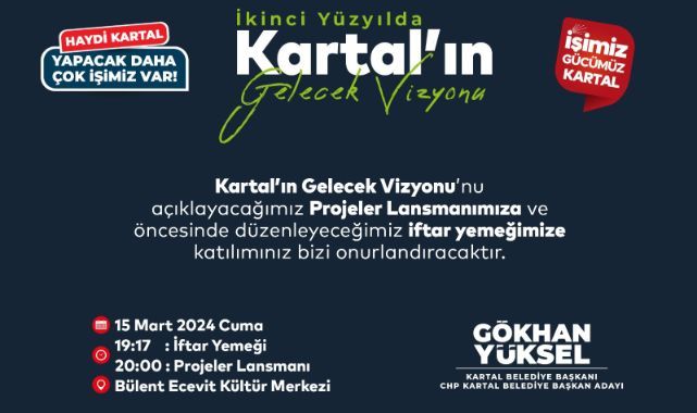 Kartal Belediye Başkanı Gökhan Yüksel, kartal için hayata geçireceği çalışma ve projeleri kamuoyuna açıklayacak.Güven, huzur dolu yarınlar için “Haydi Kartal Yapacak Daha Çok İşimiz Var” sloganıyla 31 Mart Pazar günü gerçekleştirilecek yerel seçimlere hazırlanan Kartal Belediye Başkanı Gökhan Yüksel, gelecek dönem Kartal’da hayata geçireceği proje ve çalışmaları tanıtmak amacıyla 15 Mart Cuma günü (bugün), proje lansman toplantısı düzenleyecek. Lansman toplantısı, Bülent Ecevit Kültür Merkezi’nde saat 19.17’de verilecek iftar yemeğinin ardından, saat 20.00’de gerçekleştirecek.Tüm vatandaşları düzenlenecek programa davet eden Başkan Gökhan Yüksel yayımladığı mesajında, “Cumhuriyet’in ikinci yüzyılında Kartal’ın Gelecek Vizyonu’nu açıklayacağımız ‘Proje Lansman Programı’ ve öncesinde düzenleyeceğimiz iftar yemeğimize tüm komşularımızı beklerim.” ifadelerine yer verdi.Tarih: 15 Mart 2024 Cuma (bugün)