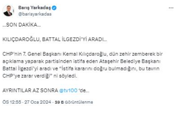 Ataşehir Belediye Başkanı Battal İlgezdi, CHP'den istifa ettiğini duyurduktan sonra, CHP'nin eski lideri Kemal Kılıçdaroğlu'nun kendisini arayarak istifa kararını doğru bulmadığını söylediği iddia edildi.Ataşehir Belediye Başkanı Battal İlgezdi, dün sosyal medya hesabı üzerinden yaptığı açıklama ile CHP'den istifa ettiğini duyurmuş, CHP'nin eski lideri Kemal Kılıçdaroğlu'na destek verenlerin tasfiye edildiğini öne sürmüştü.İlgezdi'yi Kılıçdaroğlu'nun arayarak istifa kararını doğru bulmadığını söylediği iddia edildi.Gazeteci Barış Yarkadaş'ın sosyal medya hesabı üzerinden bildirdiği gelişmeye göre Ataşehir Belediye Başkanı Battal İlgezdi'nin CHP'den istifasıyla ilgili yeni bir gelişme yaşandı.Yarkadaş sosyal medya hesabından konuyla ilgili şu ifadeleri kullandı:"KILIÇDAROĞLU, BATTAL İLGEZDİ'Yİ ARADI…CHP'nin 7. Genel Başkanı Kemal Kılıçdaroğlu, dün zehir zemberek bir açıklama yaparak partisinden istifa eden Ataşehir Belediye Başkanı Battal İlgezdi'yi aradı ve 'İstifa kararını doğru bulmadığını, bu tavrın CHP'ye zarar verdiği'ni söyledi."