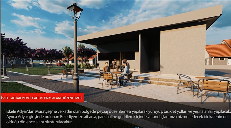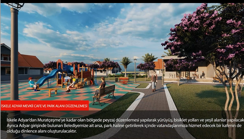 İskele Adyar’dan Murat Çeşme’ye kadar olan bölgede peyzaj düzenlemesi yapılarak yürüyüş, bisiklet yolları ve yeşil alanlar yapılacak.Ayrıca Adyar girişinde bulunan Belediyemize ait arsa, park haline getirilerek içinde vatandaşlarımıza hizmet edecek bir kafenin de olduğu dinlence alanı oluşturulacaktır.