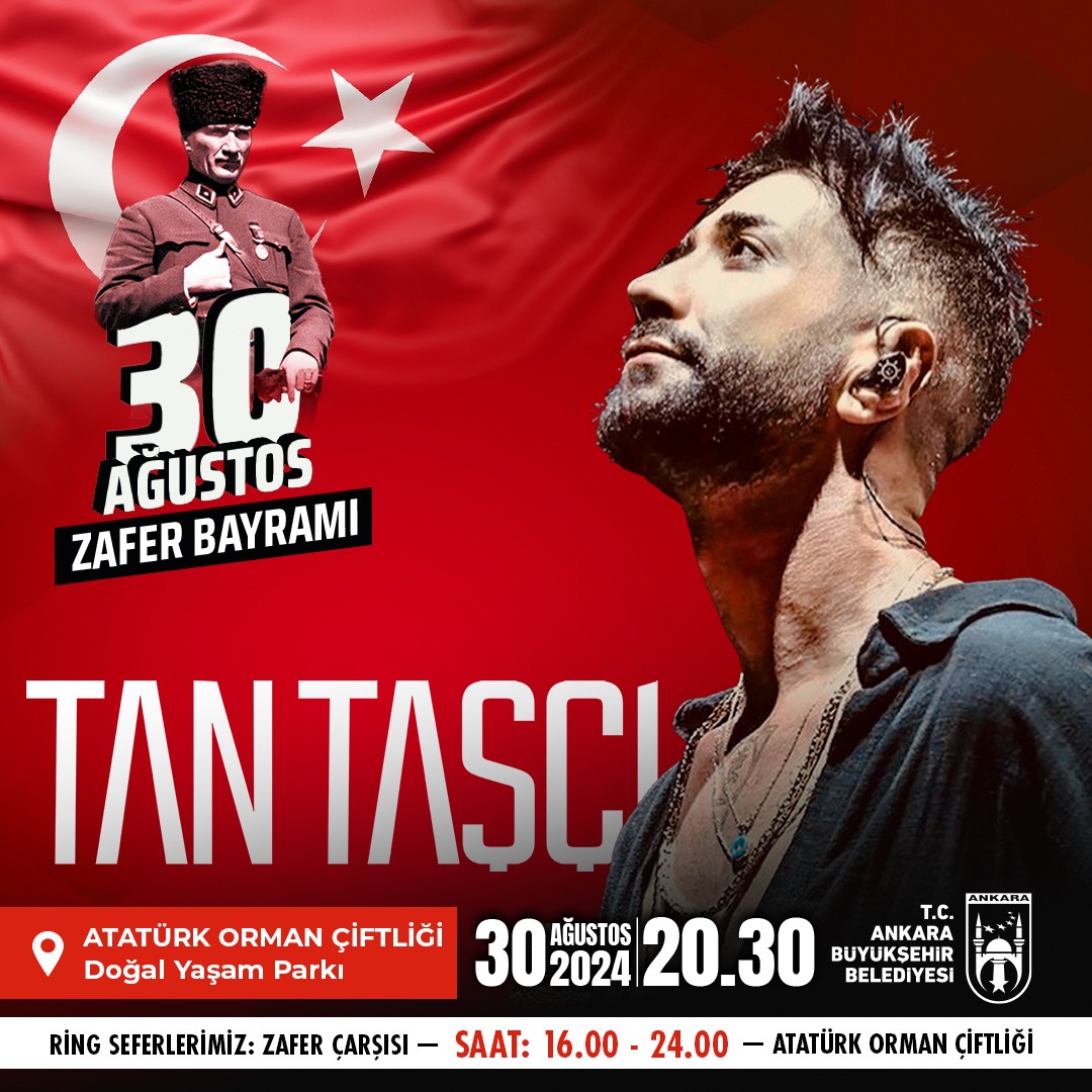 Tan Taşçı’dan Büyük Zafer Konseri30 Ağustos akşamı saat 20.30’da Atatürk Orman Çiftliği Doğal Yaşam Parkı’nda ünlü sanatçı Tan Taşçı, Zafer Bayramı’na özel bir konser verecek. Konser, tüm Ankaralıları Zafer Bayramı coşkusunu paylaşmaya davet ediyor.Etkinlikler için 30 Ağustos tarihinde Zafer Çarşısı’ndan Atatürk Orman Çiftliği’ne saat 16.00’dan gece yarısı 00.00’a kadar ücretsiz ring seferleri düzenlenecek.Ankara Büyükşehir Belediyesi, 30 Ağustos Zafer Bayramı’nı tüm şehirde büyük bir coşku ve birlik içinde kutlamak için hazırlıklarını tamamladı. Etkinliklere katılım çağrısında bulunan Belediye, Ankaralıların bu özel günü birlikte kutlamalarını arzuluyor.