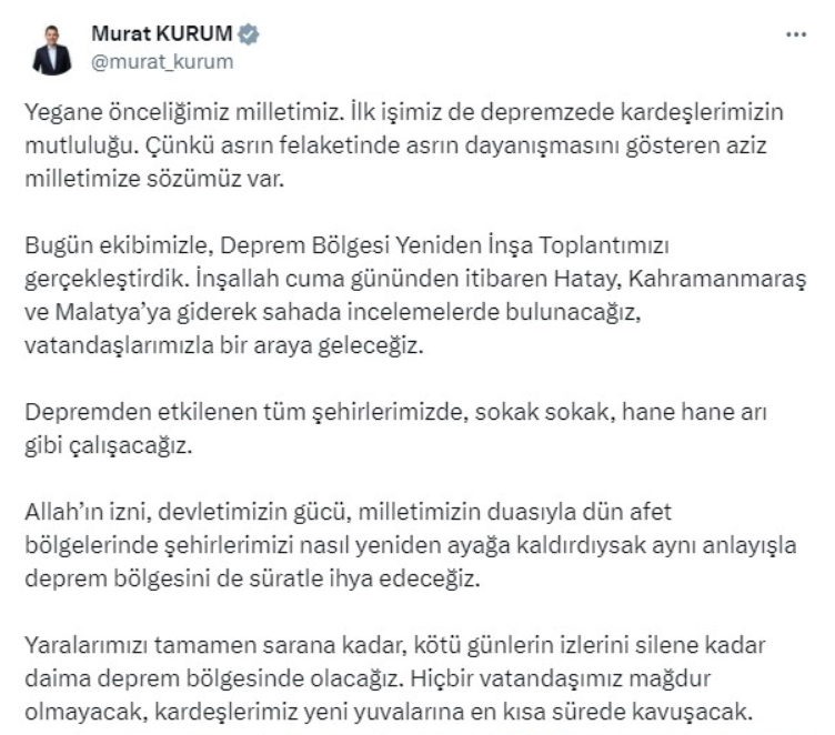Çevre, Şehircilik ve İklim Değişikliği Bakanı Murat Kurum, Hatay, Kahramanmaraş ve Malatya gibi depremden etkilenen şehirleri ziyaret edeceğini duyurdu.Bakan Kurum, "Asrın felaketinde asrın dayanışmasını gösteren aziz milletimize sözümüz var. Depremden etkilenen tüm şehirlerimizde, sokak sokak, hane hane arı gibi çalışacağız" dedi.Kurum, yeni görevinin ilk icraatı olarak deprem bölgesini ziyaret edeceğini ve vatandaşlarla bir araya geleceğini belirtti.Ayrıca, Deprem Bölgesi Yeniden İnşa Toplantısı'nın yapıldığını ve yakın zamanda sahada incelemelerde bulunacaklarını açıkladı.Bakan, "Milletimizin duası ve devletimizin gücüyle, deprem bölgesini hızla ihya edeceğiz.Yaralarımızı sarmak ve mağduriyetleri gidermek için sürekli olarak çalışacağız.Hiçbir vatandaşımız mağdur olmayacak, kardeşlerimiz yeniden yuvalarına kavuşacak" şeklinde konuştu.