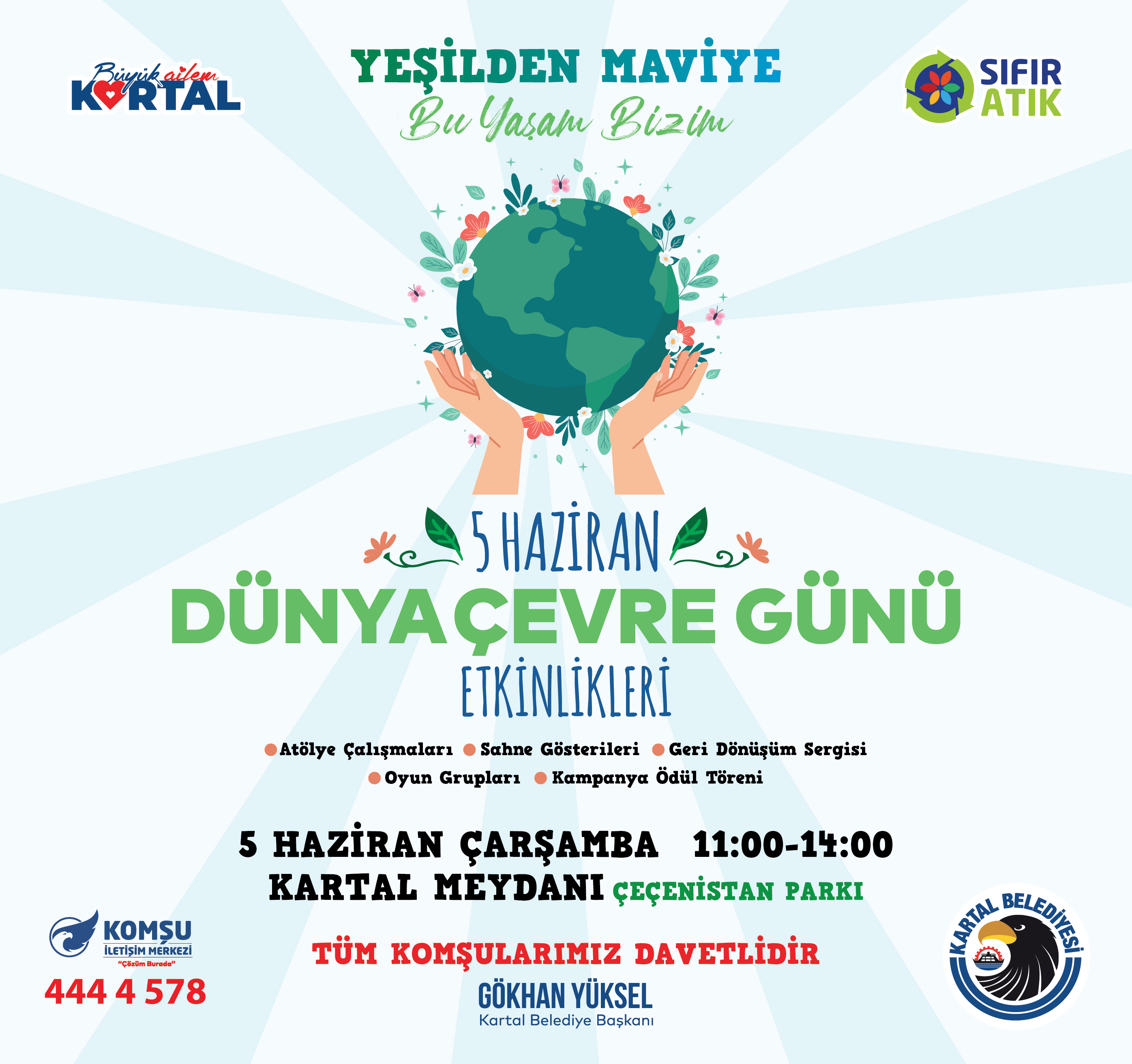 11.00-14.00 saatleri arasında Kartal Meydanı’nda çevre temalı etkinlikler, atölye çalışmaları, dans gösterileri, geri dönüşüm sergisi, oyun ve yarışmalarla Dünya Çevre Günü kutlanacak.6 Haziran Perşembe