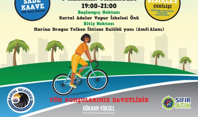 18.30-21.00 saatleri arasında “Atıklar Geri Pedallar İleri Dönsün” sloganı ile Kartal Adalar Vapur İskelesi’nden başlanarak Marina Dragos Yelken İhtisas Kulübü yanına (amfi alanı) değin (Sahil Parkı bisiklet yolu güzergâhı) bisiklet turu yapılacak.Bisiklet turu etkinliğinin ardından ise vatandaşlar ve katılımcılara özel bitiş noktasında yer alan amfi tiyatro alanında keyifli bir müzik dinletisi gerçekleşecek. Etkinliğe katılanlar arasında bir de bisiklet çekilişi yapılacak.5 Haziran Çarşamba “Dünya Çevre Günü”