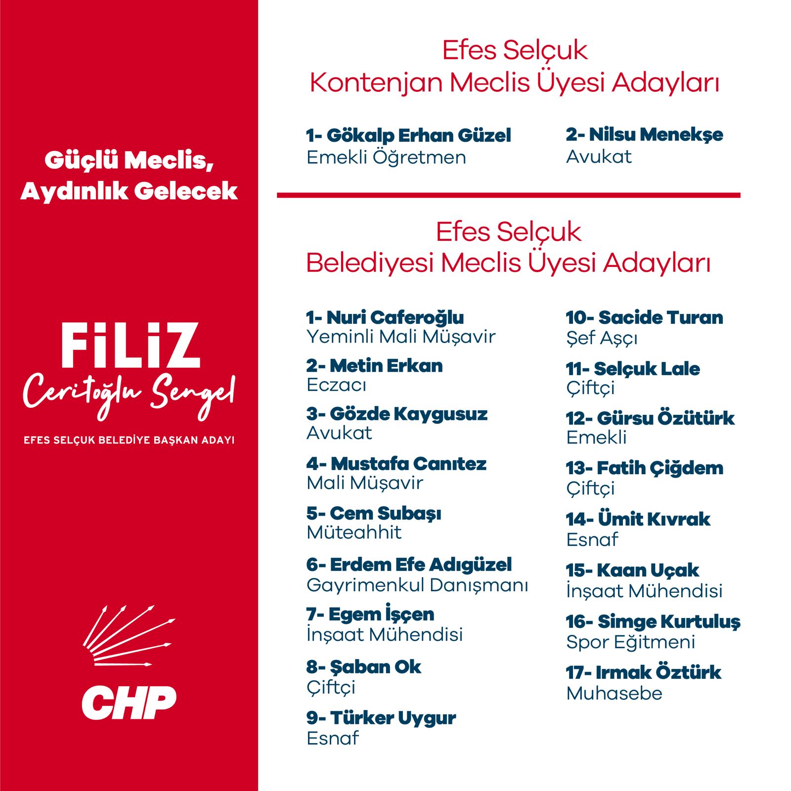 Yapılan konuşmaların ardından Başkan Filiz Ceritoğlu Sengel, Cumhuriyet Halk Partisi Belediye Meclis Üyesi Listesi’nde yer alan isimleri tek tek tanıttı.