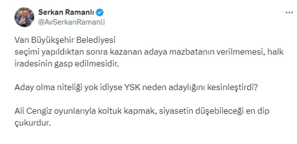 Van'da DEM Parti'den Belediye Başkanı olarak seçilen Abdullah Zeydan'ın seçilme hakkı geri alındı.HÜDA-PAR Genel Başkan Yardımcısı Serkan Ramanlı, DEM Parti'ye destek açıklaması yaparken, Cübbeli Ahmet olarak bilinen Ahmet Mahmut Ünlü ise HÜDA PAR'a tepki gösterdi.