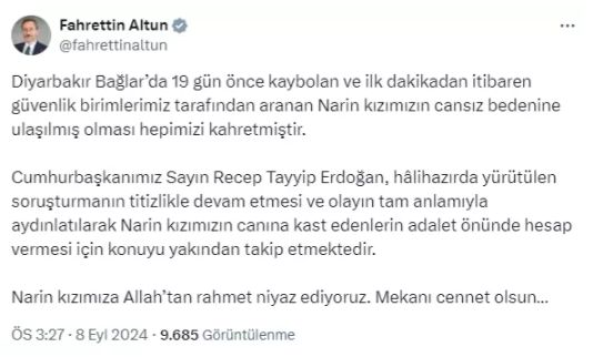 Diyarbakır'ın Bağlar ilçesinde 19 gün önce kaybolan 8 yaşındaki narin Güran'ın cansız bedeni bulundu. Bu acı gelişmenin ardından Cumhurbaşkanı Recep Tayyip Erdoğan, olayla ilgili yürütülen soruşturmanın titizlikle devam etmesi ve olayın tam anlamıyla aydınlatılması için talimat verdi. İletişim Başkanı Fahrettin Altun, Cumhurbaşkanı Erdoğan'ın talimatını duyurdu ve olayın takip edildiğini belirtti.İletişim Başkanı Fahrettin Altun, yaptığı açıklamada, Cumhurbaşkanı Erdoğan'ın Narin Güran'ın ölümüne ilişkin yürütülen soruşturmanın titizlikle sürdürülmesi için talimat verdiğini belirtti.Altun, “Cumhurbaşkanımız Sayın Recep Tayyip Erdoğan, hâlihazırda yürütülen soruşturmanın titizlikle devam etmesi ve olayın tam anlamıyla aydınlatılarak Narin kızımızın canına kast edenlerin adalet önünde hesap vermesi için konuyu yakından takip etmektedir. Narin kızımıza Allah'tan rahmet niyaz ediyoruz. Mekanı cennet olsun” şeklinde konuştu.21 Ağustos'ta Bağlar ilçesi Tavşantepe Mahallesi'nde Kur’an kursuna giden Narin Güran, kurs çıkışında evine dönmeyince ailesi tarafından aranmaya başlandı. Arama çalışmaları sonuç vermeyince, Narin’in babası Arif Güran, kızı için kayıp başvurusu yaptı. Bölgeye çok sayıda arama kurtarma ekibi sevk edildi ve mahalledeki evler ile köye giriş yapan araçlarda arama yapıldı.Soruşturma kapsamında Narin Güran’ın ağabeyi E.G. (18), kolundaki ısırık izleri nedeniyle gözaltına alındı. Ancak, İstanbul Adli Tıp Kurumu'ndaki incelemede izlerin Narin'e ait olup olmadığı tespit edilemeyince serbest bırakıldı.Ardından, Narin’in amcası ve kırsal Tavşantepe Mahallesi’nin muhtarı Salim Güran gözaltına alındı. Salim Güran’ın aracından alınan DNA örneklerinin Narin’in kıyafetlerindeki DNA örnekleriyle eşleşmesi sonucu ‘kasten öldürme’ ve ‘kişiyi hürriyetinden yoksun kılma’ suçlarından tutuklandı.Yapılan arama çalışmalarında, mahalleye 2 kilometre uzaklıktaki Eğertutmaz Deresi'nde Narin Güran’ın cansız bedeni bulundu. Narin'in, öldürüldükten sonra çuvalla dereye atıldığı ve üzerinin taşla kapatıldığı tespit edildi.Bu trajik olayın ardından Cumhurbaşkanı Erdoğan’ın olayın aydınlatılması ve adaletin sağlanması için verdiği talimat, toplumda geniş yankı uyandırdı.