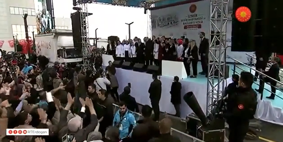İzmir Bayraklı Şehir Hastanesi'nin açılışını yapan Cumhurbaşkanı Erdoğan'ın kurdele kesimi sırasında, "Makaslar bugünün hatırasına kurdeleyi kesenlerde kalacak.