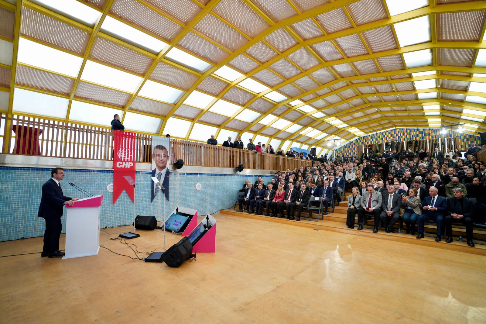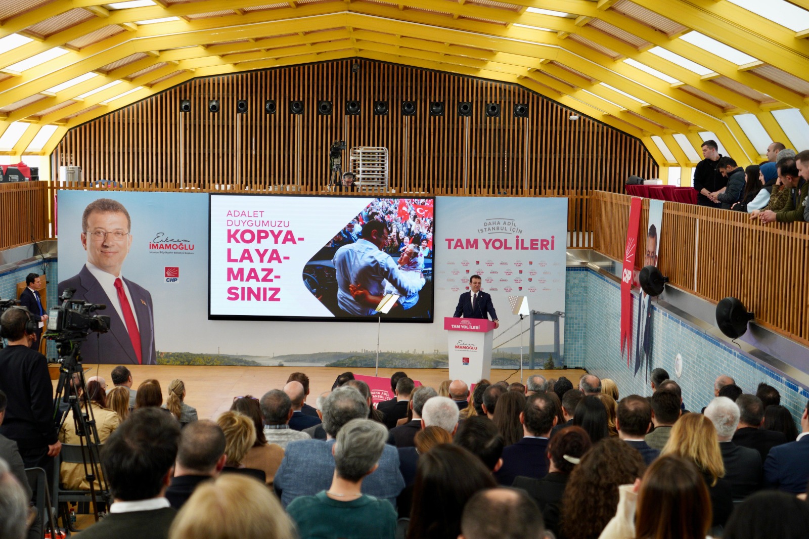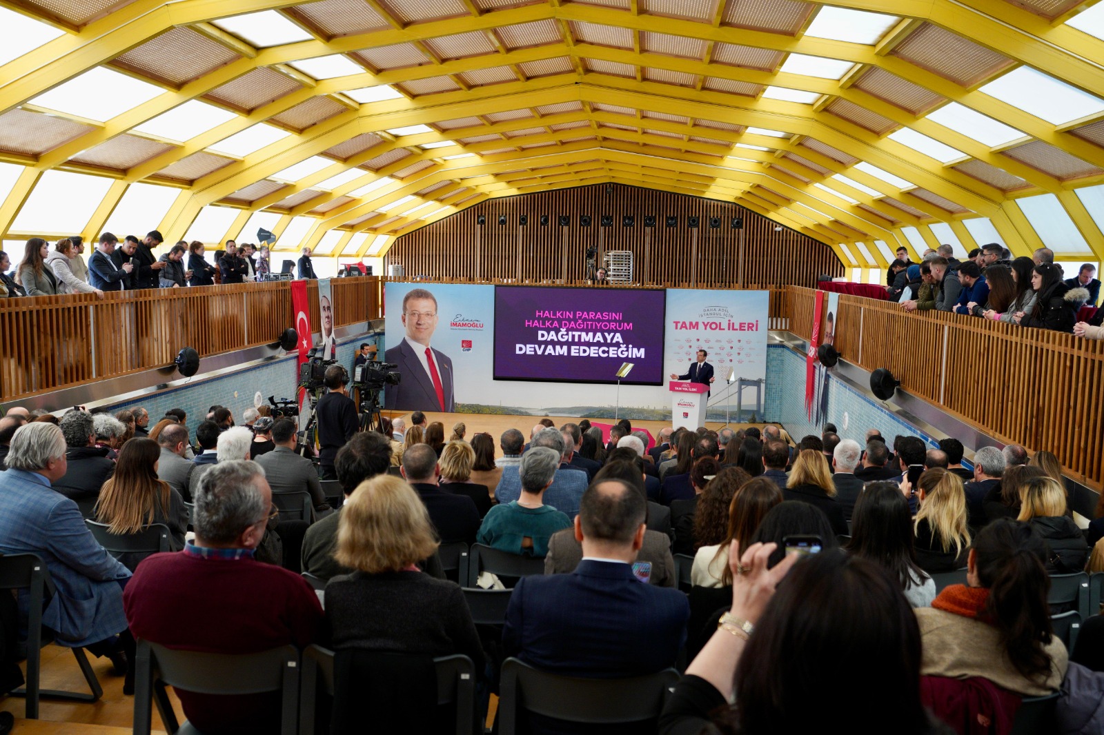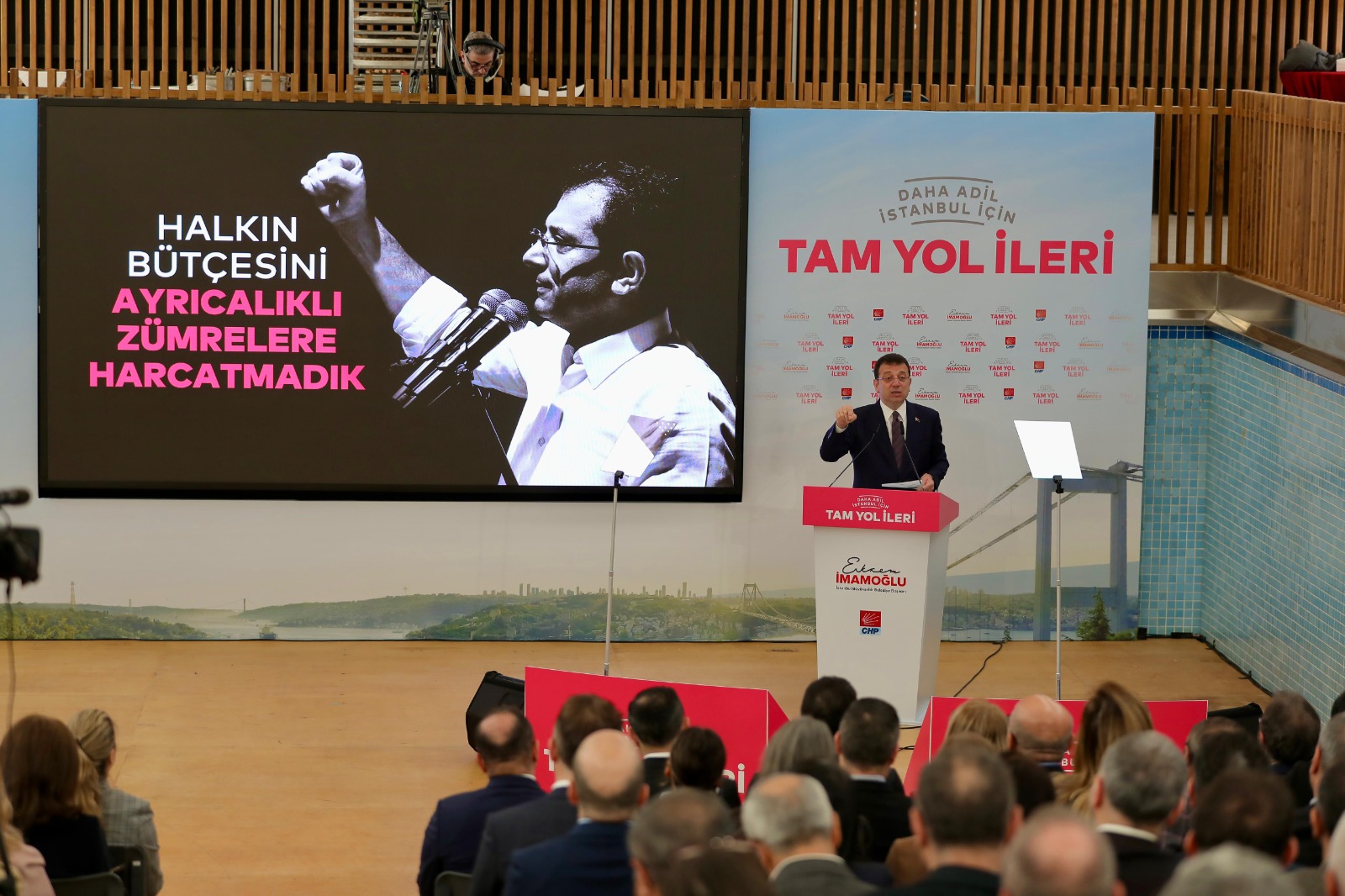 “Ne dediler: ‘İmamoğlu gelirse, sosyal yardımlar kesilir.’ Biz, bir tek şeyi kestik: Halkın bütçesinden bir avuç insana, malum vakıf ve derneklere para aktaran o hortumu, o kirli hortumu kestik. Bundan sıfır taviz verdik. Partizanlıktan tamamen arındırılmış, vatandaşa saygılı, toplumsal dayanışmayı öne çıkaran, halkçı bir sistem kurduk. İsrafı bitirdik, hizmeti getirdik.Sonuç; İstanbul tarihinde görülmemiş ölçüde artırdığımız sosyal destek ve yardımlar oldu. Sonuç, sosyal adaleti sağlamak amacıyla vatandaşa ilk kez sunulan pek çok yeni hizmet oldu. Halk Süt’ten Anne Kart’a, kreşlerden öğrenci yurtlarına, Kent Lokantaları’ndan Yeni Doğan Destek Paketi’ne, üniversite öğrencilerine burstan Ders Atölyeleri’ne desteklerimizi ihtiyaçlara göre çeşitlendirdik.Bütün bunlar eşi benzeri görülmemiş, çok önemli ve çok değerli çözümler. Ama bizim sosyal adalet vizyonumuzun yalnızca bir yönünü gösteriyorlar. 200 bin kişinin özel sektörde iş bulmasına aracılık eden Bölgesel İstihdam Ofislerimize; çiftçilere, üreticilere ve balıkçılara İBB tarihinde ilk kez vermeye başladığımız desteklere; mahalle bakkallarını destekleyen Halk Bakkal projesi gibi işlerimize bakarsanız, sosyal adalet vizyonumuzun diğer yönünü de görebilirsiniz.”“EN ZOR ZAMANLARINDA VATANDAŞLARIMIZIN YANINDA OLDUK”“Biz, yoksulluğun sürdürülüp, siyaseten istismar edilmesini değil, sonlandırılmasını hedefleyen anlayışla çalıştık” diyen İmamoğlu, “İnsanlarımız belediyeden aldığı yardım ve destekle değil; çalışarak, üreterek kazandığı parayla rahatça yaşayabilsin diye, yenilikçi çözümler geliştirdik.Bütün yatırımlarımızı bu anlayışla, bilimsel veriler ve halkımızın talep ve ihtiyaçları doğrultusunda planlayarak gerçekleştirdik. İstanbul’u adil bir kent yapmak için çok çalıştık. Bu şehirde desteğe ihtiyacı olan kimseyi geride bırakmadık. En zor zamanlarında vatandaşlarımızın yanında olduk” şeklinde konuştu. “EN ÇOK ÇÖZÜM ÜRETTİĞİMİZ EN ÖNEMLİ KESİM, ÇOCUKLARIMIZ OLDU”İmamoğlu, görsel içeriklerle desteklediği sunumunun “yaptıklarımız” bölümünde şu hizmetleri sıraladı:“5 sene boyunca en çok çözüm ürettiğimiz en önemli kesim, çocuklarımız oldu. Çocuklar hem İstanbul’umuzun hem de Türkiye’mizin geleceği. Onlar her şeyin en iyisini hak ediyorlar. ‘Süt, her çocuğun hakkı’ diye çıktığımız bu yolda, İBB tarihindeki bir ilke daha imza attık ve Halk Süt’ü hayata geçirdik. İstanbul’un kaynaklarını çocuklarımızın gelişimini sağlayacak çözümlere kullandık.2019’dan itibaren, 3-6 yaş arasındaki 262 bin çocuğa, toplamda 27 milyon litre süt ulaştırdık. Ülke ekonomisinin doğru yönetilmediği bugünlerde, bazı ailelerimiz, maalesef çocuklarının yanına beslenme çantası bile vermekte zorlanıyor. İBB olarak biz devreye girdik ve 39 ilçede, 100’ün üzerinde okulda gerçekleşen dağıtımlarla, öğrencilerimize 823 bin beslenme desteği sağladık.Çocuklarımıza en önemli yatırımı yaparak, onların eğitimini ve geleceklerini güvence altına almaya devam ettik. 100 farklı mahallede ‘Yuvamız İstanbul Merkezi’ açarak, 3-6 yaş arasındaki okul öncesi eğitim alan 10 bine yakın çocuğumuza ulaştık. ‘Sen Oku Diye’ başlattığımız projemizde, ilköğretim ve lisede okuyan ve ebeveyn kaybı yaşayan 416.525 yetim, öksüz, engelli, şehit ve gazi çocuklarına, yaklaşık 179 milyon lira destek sağladık. 5 yıl boyunca İstanbullu kadınlar için, birçok yeni hizmet gerçekleştirdik, onlara her zaman destek olduk.İlk işimiz, söz verdiğimiz gibi, ‘Anne Kart’ projemizi hayata geçirmek oldu. İstanbul’da yaşayan annelerin de sosyal hayata katılımını arttırdık ve aile ekonomilerine destek olduk. Mutlulukla söylüyorum ki, 650 bin anne, 0-4 yaş çocuklarıyla toplu taşımada ücretsiz yolculuk yapabildi.”“KADIN ÇALIŞAN SAYISINDA YÜZDE 36, KADIN YÖNETİCİ SAYISINDA YÜZDE 148 ORANINDA ARTIŞ GERÇEKLEŞTİRDİK”“Göreve geldiğimizde beni en çok şaşırtan konulardan biri de belediyenin üst kademe yöneticileri arasında, kadın sayısının yok denecek kadar az olmasıydı” diyen İmamoğlu, “Hatta çok sayıda birimde, kadın çalışan bulunmuyordu. İBB tarihinde bir ilk olarak, üst düzey yönetici kadrosuna kadın yöneticiler atadık.Bizden önce kadın genel sekreter yardımcısı hiç olmamışken, şu anda görevde 2 kadın genel sekreter yardımcımız bulunuyor. Kadın çalışan sayısında yüzde 36, kadın yönetici sayısında yüzde 148 oranında artış gerçekleştirdik.Otobüs şoförü, tren sürücüsü, otobüs şoförü, istasyon sorumlusu cankurtaran pozisyonlarında ilk kez kadın istihdamı sağladık. İstanbullu kadınları; sosyal, psikolojik, hukuki, sağlık ve eğitim gibi her alanda desteklemek ve güçlendirmek için, 7 ‘İBB Kadın Merkezi’ açtık, 5611 kadına bu merkezlerimizde destek verdik” bilgilerini paylaştı. “GÜVENLİ ÖĞRENCİ YURTLARI AÇTIK”“Şehir dışından gelen öğrencilerimiz, kalacak yer derdi düşünmesin ve aileleri huzurlu olabilsinler diye, güvenli öğrenci yurtları açtık” diyen İmamoğlu, öğrenciler ve öğretmenler için yaptıkları hizmetleri şöyle sıraladı: “5.191 kişi kapasiteli, 8’ı kız 6’sı erkek, toplamda 14 öğrenci yurduyla, 7/24 güvenlikli ve depreme dayanıklı yurtlar inşa ettik. Geçim sıkıntısı çeken gençlerimiz, nasıl yaşayacaklarını dert etmesinler, sadece derslerine konsantre olsunlar, projeler geliştirsinler diye, ‘Genç Üniversiteli Desteği’mizle, 2019 yılından beri geri ödemesiz olarak 300 bin öğrenciye, yaklaşık 1,5 milyar lira burs vererek, destek olduk.LGS ve YKS’ye hazırlanan gençlerimiz için de çalıştık. 8. ve 1