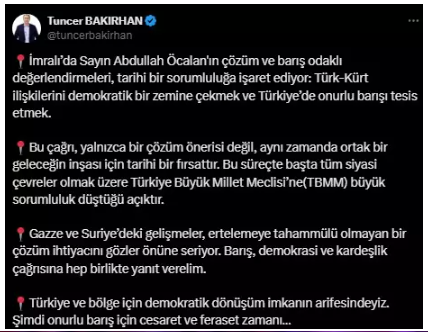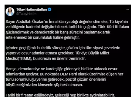 “İmralı'da Sayın Abdullah Öcalan'ın çözüm ve barış odaklı değerlendirmeleri, Türk-Kürt demokratik bir zemine çekim adına tarihi bir sorumluluk programıdır. Bu süreç, yalnızca bir çözüm süreci değil; ortak geleceğin inşası için tarihi bir fırsattır.Başta tüm siyasi çevreler olmak üzere TBMM'ye büyük bir sorumluluktan vazgeçilir. Gazze ve Suriye'deki gelişmeler, çözüm satışının ertelenemez bir şekilde saklandığını gözler önünde seriyor. Türkiye için demokratik insanların arifesindeyiz. Şimdi, onurlu barış için cesaret ve feraset zamanı!”Barış Süreci Yeniden Gündemde mi?