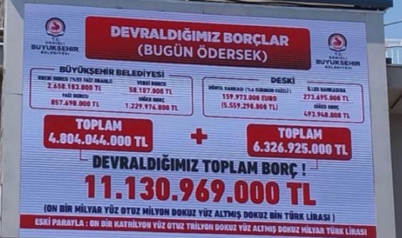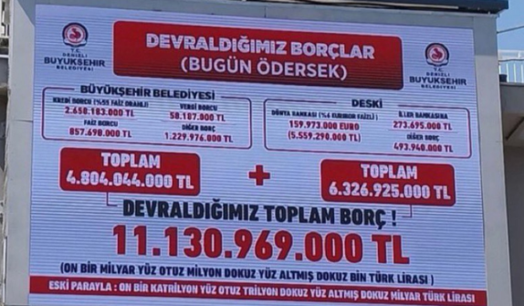 31 Mart'ta Denizli Büyükşehir Belediyesi'ne başkan seçilen CHP'li Bülent Nuri Çavuşoğlu, AK Partili Osman Zolan döneminden kalma borçları dev bir pankart yaptırıp belediye binasına astı.