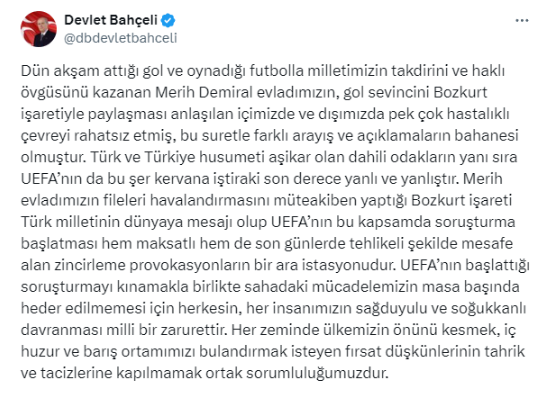 "Dün akşam attığı gol ve oynadığı futbolla milletimizin takdirini ve haklı övgüsünü kazanan Merih Demiral evladımızın, gol sevincini Bozkurt işaretiyle paylaşması anlaşılan içimizde ve dışımızda pek çok hastalıklı çevreyi rahatsız etmiş, bu suretle farklı arayış ve açıklamaların bahanesi olmuştur.""Türk ve Türkiye husumeti aşikar olan dahili odakların yanı sıra UEFA'nın da bu şer kervana iştiraki son derece yanlı ve yanlıştır. Merih evladımızın fileleri havalandırmasını müteakiben yaptığı Bozkurt işareti Türk milletinin dünyaya mesajı olup UEFA'nın bu kapsamda soruşturma başlatması hem maksatlı hem de son günlerde tehlikeli şekilde mesafe alan zincirleme provokasyonların bir ara istasyonudur."UEFA'nın Soruşturması: