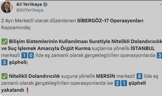 İstanbul ve Mersin merkezli çok sayıda şehirde düzenlenen iki ayrı dolandırıcılık operasyonunda toplam 56 şüpheli gözaltına alındı.İçişleri Bakanı Ali Yerlikaya şahısların; İdolFX, HunFx, RukaFX, SirusFX, ArosFx, Skybitpro ve Hit Capital adı altında 7 farklı firma üzerinden vatandaşlarla irtibat kurup kişileri dolandırdıklarını açıkladı.İstanbul ve Mersin olmak üzere 2 ayrı merkezli Sibergöz-17 operasyonlarında 15 ilde toplam 56 şüpheli yakalandı. Ayrıca operasyonlarda toplam 28 milyon 640 bin TL haksız kazanç elde edildiği tespit edildi.Yerlikaya'nın paylaşımında şu ifadeler yer aldı:"2 Ayrı Merkezli olarak düzenlenen SİBERGÖZ-17 Operasyonları Kapsamında;Bilişim Sistemlerinin Kullanılması Suretiyle Nitelikli Dolandırıcılık ve Suç İşlemek Amacıyla Örgüt Kurma suçlarına yönelik İSTANBUL merkezli 10 ilde eş zamanlı olarak gerçekleştirilen operasyonlarda 35 şüpheli;Nitelikli Dolandırıcılık suçuna yönelik MERSİN merkezli 8 ilde eş zamanlı olarak gerçekleştirilen operasyonlarda ise 21 şüpheli yakalandı.Bilişim Sistemlerinin Kullanarak Nitelikli Dolandırıcılık Yapanların Enselerindeyiz. Onlara Göz Açtırmayacağız. Emniyet Genel Müdürlüğü Siber Suçlarla Mücadele Daire Başkanlığı koordinesinde; İstanbul Siber Suçlarla Mücadele Şube Müdürlüğünce yapılan çalışmaları sonucu İstanbul merkezli İzmir, Antalya, Yalova, Balıkesir, Mersin, Ankara, Kocaeli, Siirt ve Tekirdağ'da düzenlenen "SİBERGÖZ-17" operasyonlarında Bilişim Sistemlerini Kullanarak Nitelikli Dolandırıcılık suçunu işleyen şüphelilerin;İdolFX, HunFx, RukaFX, SirusFX, ArosFx, Skybitpro ve Hit Capital adı altında 7 farklı firma üzerinden vatandaşlarla irtibat kurarak "Forex Yatırımı Vaadiyle Yüksek Kazanç" elde edeceklerini söyleyerek kişileri dolandırdıkları,Dolandırdıkları kişilerden 211.500 dolar haksız kazanç sağladıkları ve şüphelilerin banka hesap analizleri ve dijital materyallerde yapılan incelemelerde ise yaklaşık 28 milyon TL tutarında haksız kazanç elde ettikleri tespit edildi. Operasyonlar sonucunda çok sayıda dijital materyale el konuldu.Emniyet Genel Müdürlüğü Siber Suçlarla Mücadele Daire Başkanlığı koordinesinde; Mersin Siber Suçlarla Mücadele Şube Müdürlüğünce yapılan çalışmalar sonucu Mersin, Mardin, Adana, Antalya, İzmir, Samsun, Ağrı ve Malatya'da eş zamanlı olarak gerçekleştirilen "SİBERGÖZ-17" operasyonlarında şüphelilerin;Oltalama (Phishing) siteleri aracılığıyla ele geçirdikleri sosyal medya hesapları üzerinden "Yüksek Kazanç Vaadi" ile Bahis Kuponu reklamı yaparak vatandaşlarla iletişime geçtikleri ve Vatandaşlardan para talep etmek suretiyle toplam 640.000 TL haksız kazanç sağladıkları tespit edildi. Operasyonlar sonucunda çok sayıda dijital materyale ve 39 bin TL'ye el konuldu.İstanbul ve Mersin olmak üzere 2 Ayrı Merkezli Sibergöz-17 operasyonlarında 15 ilde toplam 56 şüpheli yakalandı. Ayrıca operasyonlarda toplam 28 Milyon 640 bin TL haksız kazanç elde edildiği tespit edildi.Operasyonları gerçekleştiren Kahraman Polislerimizi tebrik ediyorum. Milletimizin duası sizinle. SİBER SUÇLARLA MÜCADELEMİZ HIZ KESMEDEN DEVAM EDECEK."