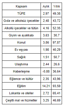 Türkiye İstatistik Kurumu (TÜİK) tarafından açıklanan verilere göre, Tüketici Fiyat Endeksi (TÜFE) eylül ayında yıllık bazda en yüksek artışın yüzde 97,87 ile konut grubunda kaydedildiği belirtildi. Bu artış, ev ve işyerlerine yapılacak kira zam oranını yüzde 63,47 seviyesine yükseltti.Eylül ayında genel enflasyon oranı bir önceki aya göre yüzde 2,97 artarken, yıllık bazda bu oran yüzde 49,38 olarak gerçekleşti. Geçen yılın aralık ayına göre ise enflasyondaki artış yüzde 35,86 olarak belirlendi. Ev ve işyeri kira artış oranı, bir önceki ay belirlenen yüzde 64,91'lik orandan gerileyerek, bu ay için yüzde 63,47 olarak belirlendi.TÜİK verilerine göre, eylül ayında ana harcama grupları arasında en fazla yıllık artış, konut grubunda yaşandı. Bunun yanı sıra, eğitim grubunda aylık bazda en yüksek artış yüzde 14,21 ile gerçekleşti. Eylülde en az artış gösteren ana grup ise ulaşım oldu; bu grup yıllık bazda sadece yüzde 26,6 oranında bir artış gösterdi. Ana harcama gruplarındaki değişimler ise şu şekildedir:Kapsam Aylık (%) Yıllık (%)TÜFE 2,97 49,38Gıda ve alkolsüz içecekler 2,48 43,72Alkollü içecekler ve tütün 4,16 52,35Giyim ve ayakkabı 3,63 30,7Konut 3,86 97,87Ev eşyası 1,98 40,29Sağlık 1,51 50,7Ulaştırma 2,44 26,6Haberleşme -0,88 36,64Eğlence ve kültür 2,35 43,96Eğitim 14,21 93,59Lokanta ve oteller 2,72 65,41Çeşitli mal ve hizmetler 3,25 46,69Özel kapsamlı TÜFE göstergelerine bakıldığında, işlenmemiş gıda ürünleri, enerji, alkollü içecekler ve tütün ile altın hariç TÜFE’de eylül ayında bir önceki aya göre yüzde 3,22, geçen yılın aralık ayına göre yüzde 36,44, geçen yılın aynı ayına göre ise yüzde 48,23 artış görüldü. Bu gösterge, tüketici fiyatlarının genel eğilimini yansıtması bakımından önemli bir veridir.Kapsam Aylık (%) Yıllık (%)Mevsimlik ürünler hariç TÜFE 2,92 51,67İşlenmemiş gıda, enerji, alkollü içecekler ve tütün ile altın hariç TÜFE 3,22 48,23Enerji, gıda ve alkolsüz içecekler, alkollü içecekler ile tütün ürünleri ve altın hariç TÜFE 3,57 49,1İşlenmemiş gıda, alkollü içecekler ve tütün ürünleri hariç TÜFE 2,84 50,05