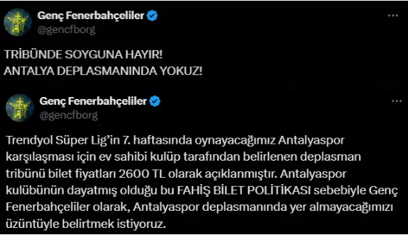 Süper Lig'de bekleneni veremeyen Fenerbahçe, son olarak Galatasaray’a 3-1 yenilerek hayal kırıklığı yarattı. Bu sonuçların ardından taraftar grupları arasında tepkiler artarken, Fenerbahçe'nin en büyük taraftar gruplarından biri olan Genç Fenerbahçeliler, Antalyaspor ile oynanacak deplasman maçı için önemli bir karar aldı.Genç Fenerbahçeliler, Antalyaspor maçındaki bilet fiyatlarını fahiş buldukları gerekçesiyle maça gitmeyeceklerini açıkladı. Taraftar grubu, bu durumu protesto etmek amacıyla bu kararı aldıklarını belirtti.Fenerbahçe camiasında yaşanan bu durum, taraftarların takım üzerindeki etkisini bir kez daha gözler önüne sererken, kulüp yönetiminin bu tür fiyatlandırmalarla ilgili nasıl bir adım atacağı merak konusu oldu.