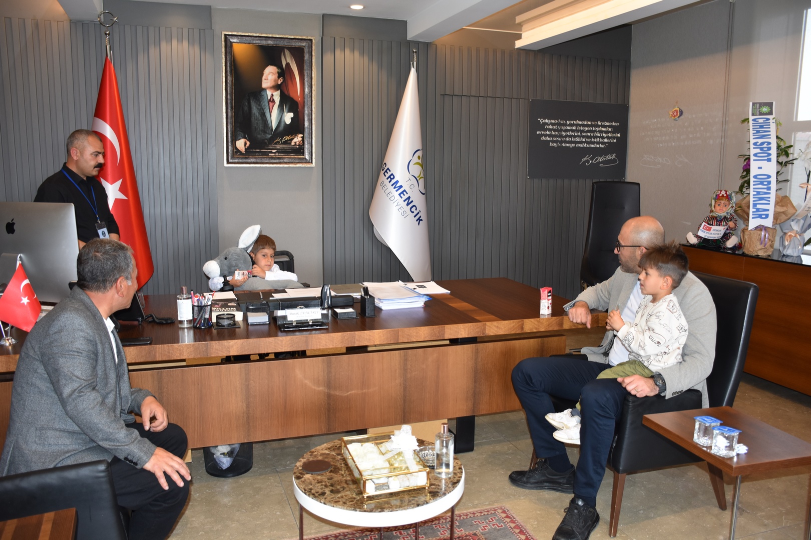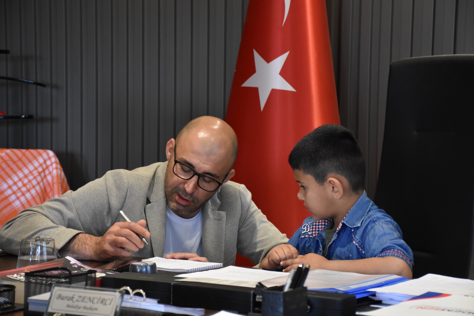 23 Nisan Ulusal Egemenlik ve Çocuk Bayramı kutlamaları kapsamında, Germencik Belediye Başkanlığı koltuğuna öğrenciler oturdu. Öğrenciler Belediye Başkanı Burak Zencirci’ye, talep ve isteklerini aktardı.Türkiye Büyük Millet Meclisi’nin (TBMM) açılışının 104’üncü yıl dönümü ve 23 Nisan Ulusal Egemenlik ve Çocuk Bayramı kutlamaları kapsamında, Germencik Hürriyet İlkokulu 1. sınıf öğrencileri Behice Gökbel, Şerife Nur Karabacak ve Muhammet Ali Duru Germencik Belediye Başkanı Burak Zencirci’yi ziyaret etti.KOLTUĞUN DİĞER SAHİBİ DE MİRAÇ OLDUOrtaklar Fatih Anaokulu’nda eğitim gören 6 yaşındaki Miraç Taşar da belediye başkanlığı makamına geçti. Miraç Taşar da taleplerini ileterek çocuk parkı ile çocuk etkinliklerinin yapılmasını istedi.TALEPLERİNİ SIRALADILARBaşkan Zencirci ile bir süre sohbet eden öğrenciler, Germencik Belediye Başkanlığı koltuğuna sırayla oturdu. Öğrenciler belediyeden çevre temizliği, çocuk parkı ile çocuk bayramı dolayısıyla etkinlikler düzenlemesini talep etti. İlgili birim müdürlerine talimat veren öğrencilerin isteklerinin yerine getirileceği belirtildi.Ziyaret sonrası Başkan Burak Zencirci, öğrenciler ve öğrencilere eşlik eden okul müdürü Burçin Yirmibeş ile sınıf öğretmeni Taner Çelikkaya ile hatıra fotoğrafı çektirdi.ZENCİRCİ: KOLTUĞUN GERÇEK SAHİPLERİNİ AĞIRLADIK23 Nisan Ulusal Egemenlik ve Çocuk Bayramı vesilesiyle belediye başkanlığı koltuğunu miniklere devrettiklerini aktaran Belediye Başkanı Burak Zencirci, “Koltuğun gerçek sahiplerini ağırladık” dedi.Zencirci “23 Nisan’ın bir geleneği olarak öğrencilerimize koltuğumuzu devrettik. Genç başkanlarımızın talep ve önerilerini dinledik. En kısa sürede çalışma gerçekleştirerek verdiğimiz sözleri yerine getireceğiz.Şunu da belirtmek isterim ki biz zaten yönetim esaslarımızı doğrudan onların beklenti ve ihtiyaçlarına göre belirliyoruz. Yani aslında her gün 23 Nisan ve onlar her gün Belediye Başkanı olarak görevdeler. Biz onlar adına yani koltuğun gerçek sahipleri adına görevlerimizi yürütüyoruz.Bu vesile ile 23 Nisan Ulusal Egemenlik ve Çocuk Bayramımızı kutluyor, Ulu Önderimiz Gazi Mustafa Kemal Atatürk ve tüm kahraman şehit ve gazilerimizi saygı ve rahmetle anıyorum.” ifadelerini kullandı.