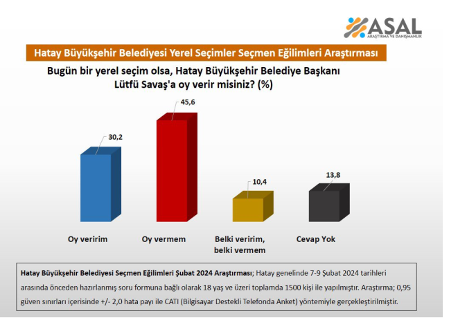 Yeniden aday olması büyük tartışma yaratan Hatay Büyükşehir Belediye Başkanı Lütfü Savaş için kentte bir anket yapıldı.Ankette vatandaşlara "Bugün yerel seçim olsa Lütfü Savaş'a oy verir misiniz?" sorusu yöneltildi. Ankete katılanların yüzde 30'u "Evet" yanıtını verirken, yüzde 45'lik kısım da oy vermeyeceğini ifade etti.Hatay Büyükşehir Belediye Başkanı Lütfü Savaş'ın yeniden aday olması sonrası patlak veren tartışmalar sürüyor.Kahramanmaraş merkezli deprem felaketinin yıldönümündeki anma töreninde de protesto edilen Savaş'la ilgili kentte yapılan anket çalışması CHP yönetimini kara kara düşündürecek.ASAL Araştırma Şirketi tarafından 7-9 Şubat 2024 tarihleri arasında Hatay'ın 11 ilçesinde 18 yaş ve üzeri 1500 kişiyle CATI (Bilgisayar destekli telefonla anket) yöntemiyle yapılan ankette seçmenlere, "Bugün bir yerel seçim olsa, Hatay Büyükşehir Belediye Başkanı Lütfü Savaş'a oy verir misiniz?" sorusu yöneltildi.Anketten çıkan sonuç şöyle;Oy veririm: %30,2Oy vermem: %45,6Belki veririm, belki vermem: %10,4Cevap yok: %13,8