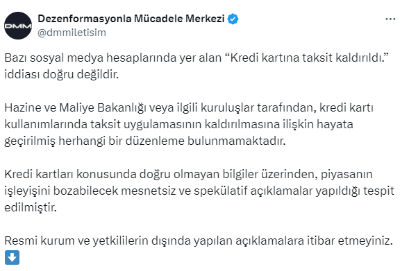 Kredi kartlarına taksit uygulamasının kaldırıldığına yönelik iddia kamuoyunda geniş yankı uyandırdı. İddiaları yalanlayan Hazine ve Maliye Bakanı Mehmet Şimşek, "Piyasalarda tedirginlik ve güvensizlik oluşturmaya yönelik kasıtlı haberler dolaşıma sokulmaktadır.Vatandaşlarımızdan istirham ediyorum; lütfen bizden duymadığınız hiçbir habere itibar etmeyiniz" dedi.Sosyal medyada ortaya atılan "Kredi kartlarına taksit uygulaması sonlandırıldı" iddiası kamuoyunda geniş yankı uyandırdı. Çok sayıda haber sitesi konuyu manşetlerine taşırken, iddialara yanıt Hazine ve Maliye Bakanı Mehmet Şimşek'ten geldi.Dezenformasyonla Mücadele Merkezi'nin iddiaları yalanlayan açıklamasını alıntılayan Bakan Şimşek, "Piyasalarda tedirginlik ve güvensizlik oluşturmaya yönelik kasıtlı haberler dolaşıma sokulmaktadır. Orta Vadeli Programımızda uygulayacağımız politikaları net bir şekilde ortaya koyduk.Kurala dayalı ve öngörülebilir politikalarımız seçim sonrası dönemde de aynen devam edecektir. Bu çerçevede vatandaşlarımızdan istirham ediyorum; lütfen bizden duymadığınız hiçbir habere itibar etmeyiniz" ifadelerini kullandı.Mehmet Şimşek'in alıntıladığı ve Dezenformasyonla Mücadele Merkezi tarafından yapılan paylaşımda ise şu ifadeler yer alıyordu; "Bazı sosyal medya hesaplarında yer alan 'Kredi kartına taksit kaldırıldı' iddiası doğru değildir.Hazine ve Maliye Bakanlığı veya ilgili kuruluşlar tarafından, kredi kartı kullanımlarında taksit uygulamasının kaldırılmasına ilişkin hayata geçirilmiş herhangi bir düzenleme bulunmamaktadır.Kredi kartları konusunda doğru olmayan bilgiler üzerinden, piyasanın işleyişini bozabilecek mesnetsiz ve spekülatif açıklamalar yapıldığı tespit edilmiştir. Resmi kurum ve yetkililerin dışında yapılan açıklamalara itibar etmeyiniz."