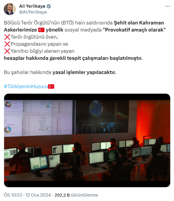İçişleri Bakanı Ali Yerlikaya, Pençe-Kilit Harekatı'nda şehit olan askerlere yönelik sosyal medyada terör örgütünü öven ve yanıltıcı bilgiyi yayarak provokatif paylaşımlarda bulunan hesaplar hakkında yasal işlem başlatılacağını duyurdu.İçişleri Bakanı Ali Yerlikaya, sosyal medyada 'provokatif amaçlı olarak' terör örgütünü öven, propagandasını yapan ve yanıltıcı bilgiyi alenen yayan hesaplar hakkında gerekli tespit çalışmalarının başlatıldığını duyurdu.Milli Savunma Bakanlığı (MSB), Irak'ın kuzeyindeki Pençe-Kilit Harekatı bölgesindeki bir üs bölgesine sızmaya çalışan teröristlerle çıkan çatışmada 9 askerin şehit olduğunu bildirdi.Acı haber sonrası İçişleri Bakanı Ali Yerlikaya, sosyal medya üzerinden yaptığı açıklamada, "Bölücü Terör Örgütü'nün (BTÖ) hain saldırısında şehit olan kahraman askerlerimize yönelik sosyal medyada 'provokatif amaçlı olarak' terör örgütünü öven, propagandasını yapan ve yanıltıcı bilgiyi alenen yayan hesaplar hakkında gerekli tespit çalışmaları başlatılmıştır.Bu şahıslar hakkında yasal işlemler yapılacaktır" ifadelerini kullandı.