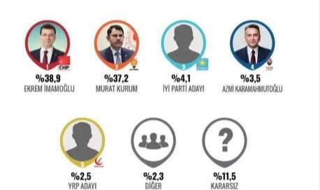 ORC Araştırma'nın 15-18 ocak tarihleri arasında yaptığı ankete göre; CHP'nin adayı Ekrem İmamoğlu, Cumhur İttifakı'nın adayı Murat Kurum'un 1 puan önünde yer aldı.İYİ Parti adayının yüzde 4.1 aldığı ankette Zafer Partisi'nin adayı ise yüzde 3.5'lik kesimin desteğini almayı başardı.ORC Araştırma, Cumhur İttifakı'nın İBB adayının Murat Kurum olduğunun kesinleşmesinin ardından 15-18 ocak tarihleri arasında yaptığı ankette 2 bin 950 kişiye "Büyükşehir Belediye Başkanlığı için hangi adaya oy vereceksiniz?" diye sordu.İmamoğlu ve Kurum arasındaki yarıştan başa baş bir sonuç çıkarken en büyük sürpriz Zafer Partisi'nin adayı yaptı.Ankete katılanların yüzde 38.9'u Ekrem İmamoğlu, yüzde 37.2'si ise Murat Kurum cevabını verirken; İYİ Parti adayına oy vereceğini söyleyenlerin oranı yüzde 4.1 çıktı.Zafer Partisi adayı Azmi Karamahmutoğlu'na oy vereceklerini söyleyenler oranı yüzde 3.5 olurken, Yeniden Refah Partisi adayına oy vereceğini söyleyenler ise yüzde 2.5'te kaldı.Ankette dikkat çeken bir başka detay da DEM Parti'nin oylarının gösterilmemiş olmasıydı. Onun yerine "Diğer" seçeneği eklendi ve oranı da 2.3 olarak gösterildi