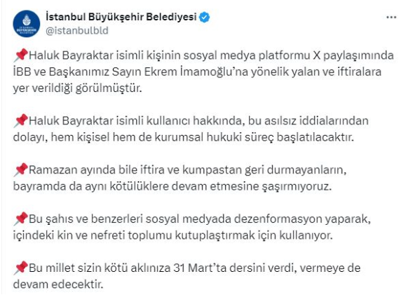 Baykar Genel Müdürü Haluk Bayraktar'ın Ekrem İmamoğlu'na yönelik, "Tasmalı köpeklerini saldırtmayı bırak" sözlerine İmamoğlu'ndan yanıt geldi. Basın mensuplarının sorularını cevaplayan İmamoğlu, Bayraktar'ın sert sözlerine "Ülkemizde bazen yetki verilmiş insanlardan daha fazla o yetkiyi pervasızca kullanma girişiminde bulunan insanlar var. Kimden bahsediyoruz? Yetkinin sahibinin yanındaki eş dost akrabadan bahsediyoruz. Ben de diyorum ki bu iş akraba işi değil kardeşim." yanıtını verdi.Baykar Genel Müdürü Haluk Bayraktar'ın, " İsrail'e jet yakıtı sattılar" iddiasını yaymakla suçladığı İBB Başkanı Ekrem İmamoğlu'nun iletişim ekibiyle ilgili polemik hala devam ediyor. İmamoğlu, Bayraktar'ın "Tasmalı köpeklerini saldırtmayı bırak" sözlerine "Ülkemizde bazen yetki verilmiş insanlardan daha fazla o yetkiyi pervasızca kullanma girişiminde bulunan insanlar var. Bu iş akraba işi değil kardeşim." yanıtını verdi.Geçtiğimiz günlerde siyasal iletişimci Evren Barış Yavuz'un "İsrail'e jet yakıtı satmışlar" diyerek Baykar şirketinin yöneticileri Selçuk Bayraktar ve Haluk Bayraktar'ın fotoğrafını paylaşmasıyla başlayan polemikte yeni bir gelişme yaşandı.İBB Başkanı İmamoğlu, Baykar Genel Müdürü Haluk Bayraktar'ın, İsrail'e jet yakıtı sattıklarına dair iddiaları yayanların arkasında İmamoğlu'nun iletişim ekibinin olduğunu öne sürerek "Bu PKK'lıları besleyen Ekrem İmamoğlu'na sesleniyorum:Tasmalı köpeklerini saldırtmayı bırak. Yalandan başka söyleyecek lafın varsa, mertçe yüzümüze söyle de cevabını verelim." demesine ilişkin konuştu.Uluslararası basın mensuplarının sorularını yanıtlayan İmamoğlu, Bayraktar'ın sert sözlerine "Beni hedef haline getirerek bir dil kullanan şahıstan bahsettiniz. Çok nezaketsiz bir davranış. Bu nezaketsiz ve iftira dolu davranışın muhatabı olmadım, olmam. Şunu da söylemem lazım. Ülkemizde bazen yetki verilmiş insanlardan daha fazla o yetkiyi pervasızca kullanma girişiminde bulunan insanlar var. Kimden bahsediyoruz? Yetkinin sahibinin yanındaki eş dost akrabadan bahsediyoruz. Ben de diyorum ki bu iş akraba işi değil kardeşim." yanıtını verdi.İmamoğlu, konuşmasının devamında "Ben İstanbul Büyükşehir Belediye Başkanı'yım ve ben hukuki, yasal yetkilerimi kullanırım. Ülkemizde son 15 yıldır farklı kavramlarla, farklı makamlarla, üzülerek söylüyorum ki, bu kavram yok sayılmıştır ve ahlak sınırlarının dışına çıkılmıştır. Bu konuşmayı yapan kişi Türkiye'de güçlü bir sanayi kuruluşu, savunma sanayi kuruluşunun başındaki insan olabilir. Ama o kadardır. Herhangi bir kişiyle eşit haklara sahiptir. Hukukun herkese eşit uygulanmasını diliyorum." ifadelerini kullandı.Öte yandan geçtiğimiz günlerde Haluk Bayraktar'ın çıkışına İBB'den açıklama gelmiş, yayınlanan yazıda 31 Mart göndermesi yapılarak, "Ramazan ayında bile iftira ve kumpastan geri durmayanların, bayramda da aynı kötülüklere devam etmesine şaşırmıyoruz. Bu şahıs ve benzerleri sosyal medyada dezenformasyon yaparak, içindeki kin ve nefreti toplumu kutuplaştırmak için kullanıyor. Bu millet sizin kötü aklınıza 31 Mart'ta dersini verdi, vermeye de devam edecektir." denilmişti.Geçtiğimiz günlerde bir gazeteci tarafından ortaya atılan iddialarda Türkiye'nin İsrail'le ticarete devam ettiği öne sürülmüştü. Gazetecinin paylaştığı belgelerde ihracat kalemleri arasında uçak yakıtı dikkat çekmişti.