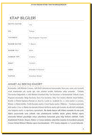 Kitap, imza incelemesi süreçleri ve bu süreçlerin nasıl işlediği hakkında da ayrıntılı bilgiler sunuyor. Okuyuculara, imza güvenliğinin nasıl sağlanabileceği ve basit taklitlerin nasıl tespit edilebileceği konusunda rehberlik ediyor. Ahmet Ali Bektaş, imza sahteciliğinin önlenmesi için bilinçli adımlar atılması gerektiğini belirtiyor.Sonuç ve Öneriler
