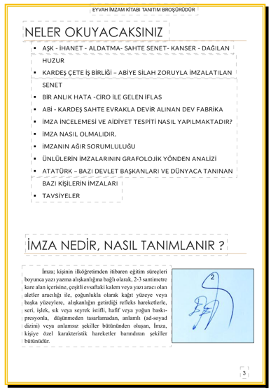 Kitap, basit imza taklitlerinden doğan felaketlerden, haksız kazanç elde eden sahtekarlıklara kadar birçok yaşanmış hikaye ve dersleri içeriyor. İmzanın sadece bir imza olmadığını, hayatın her alanında büyük sorumluluklar getirdiğini vurgulayan Ahmet Ali Bektaş, okuyucularına imza eğitiminin ne kadar önemli olduğunu gösteriyor.İmza Güvenliği ve İnceleme Süreçleri
