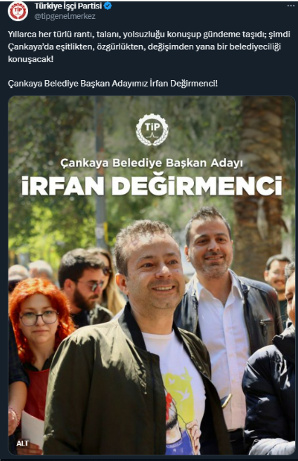 TİP, Ankara'nın Çankaya ilçesi adayı olarak gazeteci İrfan Değirmenci'yi belirledi. TİP'ten yapılan açıklamada "Yıllarca her türlü rantı, talanı, yolsuzluğu konuşup gündeme taşıdı; şimdi Çankaya'da eşitlikten, özgürlükten, değişimden yana bir belediyeciliği konuşacak! Çankaya Belediye Başkan Adayımız İrfan Değirmenci!" ifadelerine yer verildi.Gazeteci İrfan Değirmenci, Türkiye İşçi Partisi'nin (TİP) Ankara Çankaya ilçesi için belediye başkan adayı oldu. TİP, sosyal medya hesabından İrfan Değirmenci'nin adaylığını duyurdu.İrfan Değirmenci, 31 Mart'taki yerel seçimler öncesi TİP'in, Ankara'nın Çankaya ilçesinden belediye başkan adayı oldu.TİP'İN ÇANKAYA ADAYI İRFAN DEĞİRMENCİTİP'ten yapılan açıklamada şu ifadeler kullanıldı:"Yıllarca her türlü rantı, talanı, yolsuzluğu konuşup gündeme taşıdı; şimdi Çankaya'da eşitlikten, özgürlükten, değişimden yana bir belediyeciliği konuşacak! Çankaya Belediye Başkan Adayımız İrfan Değirmenci!"