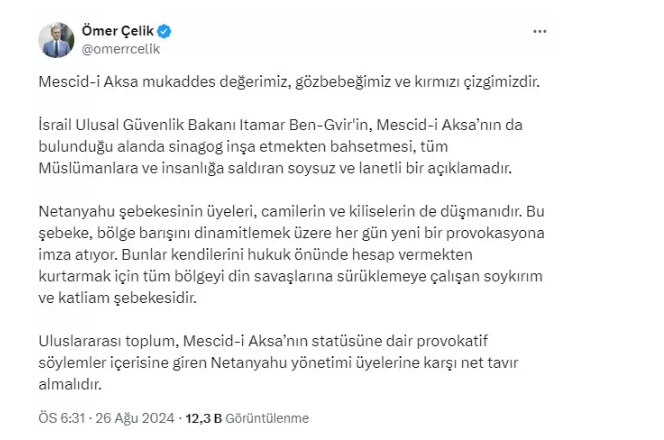 İsrail'in aşırı sağcı Ulusal Güvenlik Bakanı Itamar Ben-Gvir, Mescid-i Aksa'ya sinagog inşa edilebileceğini öne sürerek büyük bir tartışma başlattı. Ben-Gvir’in bu skandal açıklaması hem İsrail hükümeti hem de uluslararası kamuoyu tarafından sert bir şekilde karşılandı.İsrail Başbakanlık Ofisi, Ben-Gvir’in iddialarının gerçeği yansıtmadığını belirtirken, iç ve dış bakanlar Ben-Gvir’in açıklamalarını tehlikeli ve provokatif olarak nitelendirdi. Türkiye’den de Ben-Gvir’in ifadelerine yönelik güçlü tepkiler geldi.İsrail Ordu Radyosu'na konuşan Ulusal Güvenlik Bakanı Itamar Ben-Gvir, Mescid-i Aksa'ya bir sinagog inşa etmenin yasal olarak mümkün olduğunu belirtti. Ben-Gvir, "Evet, Mescid-i Aksa'ya sinagog inşa edebiliriz" diyerek bu öneriyi açıkça dile getirdi. Ben-Gvir’in açıklamaları, hem İsrail’in hem de uluslararası kamuoyunun tepkisini çekti.Ben-Gvir’in bu provokatif açıklamaları üzerine İsrail Başbakanlık Ofisi hemen harekete geçti ve resmi bir açıklama yaparak Mescid-i Aksa’daki mevcut statükonun değişmediğini vurguladı. Başbakanlık Ofisi, Ben-Gvir’in ifadelerinin gerçeği yansıtmadığını ve mevcut düzenin devam ettiğini belirtti.İsrail İçişleri Bakanı Moshe Arbel, Ben-Gvir’in açıklamalarının "tehlikeli" olduğunu ve bu tür provokatif söylemlerin kan dökülmesine yol açabileceğini ifade etti.Savunma Bakanı Yoav Gallant ise, Ben-Gvir’in önerisinin İsrail’i uluslararası alanda tehlikeye atacağını ve Müslüman dünyasında büyük bir öfkeye neden olacağını söyledi.Gallant, Ben-Gvir’in bu tür açıklamalarının hükümet için zararlı olduğunu ve uluslararası topluma karşı güçlü bir tavır alınması gerektiğini belirtti.Türkiye’den Ben-Gvir’in açıklamalarına yönelik güçlü bir tepki geldi. AK Parti Genel Başkan Yardımcısı ve Parti Sözcüsü Ömer Çelik, sosyal medya üzerinden yaptığı açıklamada Mescid-i Aksa’nın "kırmızı çizgi" olduğunu belirtti.Çelik, Ben-Gvir’in ifadelerini "soysuz ve lanetli" olarak nitelendirirken, Netanyahu yönetimini bölge barışını dinamitlemekle suçladı. Çelik, uluslararası toplumun Mescid-i Aksa’nın statüsüyle ilgili provokatif açıklamalara karşı net bir tavır alması gerektiğini ifade etti.Ben-Gvir’in açıklamaları, uluslararası alanda da geniş yankı buldu. Mescid-i Aksa'nın mevcut statüsüne yönelik bu tür tehlikeli ve provokatif ifadelerin bölgedeki gerilimi artırabileceği ve uluslararası ilişkileri olumsuz etkileyebileceği konusunda endişeler dile getirildi.İsrail hükümetinin, bu tür açıklamalara karşı nasıl bir tutum sergileyeceği ve uluslararası tepkilere nasıl yanıt vereceği ise dikkatle izleniyor.