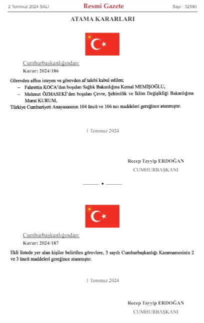 Cumhurbaşkanı Recep Tayyip Erdoğan'ın imzasıyla yayımlanan Resmi Gazete kararıyla, Çevre, Şehircilik ve İklim Değişikliği Bakanı Mehmet Özhaseki ve Sağlık Bakanı Fahrettin Koca'nın istifalarının ardından yerlerine atanan yeni bakanlar açıklandı. Bu önemli değişiklikler, Türkiye'nin çevre ve sağlık politikalarında yeni bir dönemin başlangıcını işaret ediyor.Murat Kurum Çevre, Şehircilik ve İklim Değişikliği Bakanı Oldu