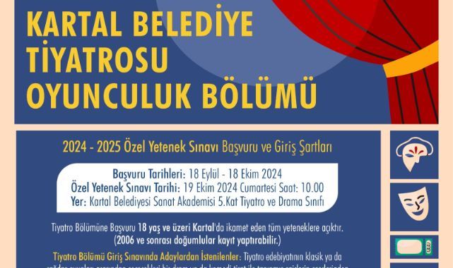 Kartal Belediye Tiyatrosu, 2023-2024 eğitim dönemi için oyunculuk bölümüne yönelik özel yetenek sınavı ön kayıtlarını almaya başladı. Kartallı gençlerin oyunculuk alanında hayallerini gerçekleştirmelerine olanak tanımak amacıyla başlatılan bu program, tiyatroya gönül verenlere profesyonel eğitim fırsatı sunuyor.Ön kayıtlar, 18 Eylül - 18 Ekim 2024 tarihleri arasında kartal Belediyesi’nin resmi internet sitesi üzerinden yapılabilecek. Tiyatro eğitimine katılmak isteyen 18 yaş ve üzeri, Kartal’da ikamet eden tüm yetenekli bireyler başvuruda bulunabilecek.Özel yetenek sınavı 19 Ekim 2024 Cumartesi günü saat 10.00’da Kartal Belediyesi Sanat Akademisi’nin 5. katında yer alan Tiyatro ve Drama Sınıfı’nda gerçekleştirilecek.Adaylardan, klasik ya da çağdaş tiyatro oyunlarından seçecekleri bir tirat ile tanınmış şairlerin eserlerinden bir şiiri ezbere sunmaları ve belirledikleri bir şarkıyı söylemeleri istenecek. Ayrıca adaylar, müziksel duyarlılıkları (kulak, ritim) açısından da değerlendirilecek.Kartal Belediye Tiyatrosu’nun bu girişimi, genç yeteneklere tiyatro dünyasına adım atma şansı tanırken, tiyatro eğitimi almak isteyenlere önemli bir fırsat sunuyor.