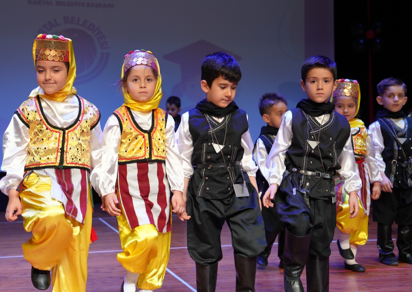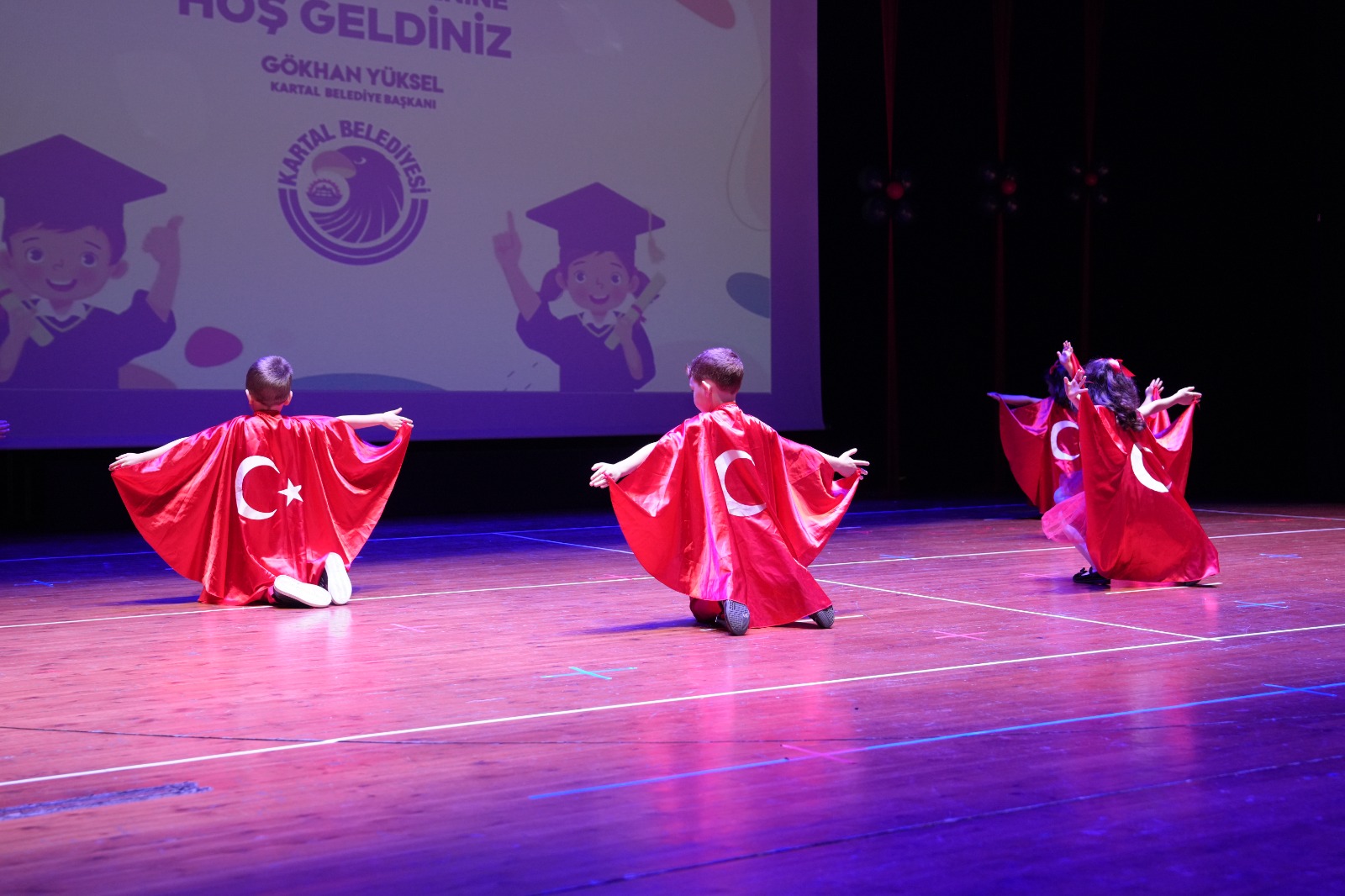 Kartal Belediyesi kreşlerinden mezun olan öğrencilerin, bir alt sınıftaki öğrencilere bayrak devir teslim töreni ile başlayan gösteriler salonda duygusal anlar yaşanmasına neden oldu. Bayrak devir teslimi, öğrenciler arasında birlik ve devamlılık duygusunu pekiştirirken, veliler için de anlamlı bir anı oluşturdu.Kreş öğrencileri, hazırladıkları dans gösterileri ile sahneye çıktı. Latin dansları, modern danslar ve çeşitli yörelerden halk oyunları ile jimnastik danslarını sergileyen minikler, izleyicilerden büyük alkış aldı. Veliler, çocuklarını sahnede izlerken gurur ve mutluluk dolu anlar yaşadı.Bu gösteriler, çocukların yıl boyunca edindikleri becerileri sergilemeleri açısından da davetliler tarafından ilgiyle izlendi.Coşkulu Mezuniyet Kutlaması